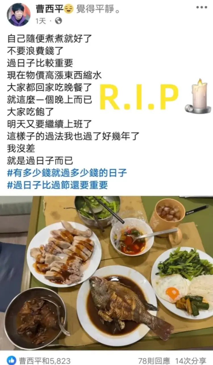 而且在今年的12月27日,宜兰发生7级强震,全台摇晃超过1分钟,在经历惊魂震动的他,在29日凌晨写下人生感悟,这或许是在安慰受惊的网友,但更像是在和自己的一生和解。而他生前最后一次公开分享,还晒出了自己的晚餐,平静写道“我没差、就是过日子而已”,这份淡然让人动容。