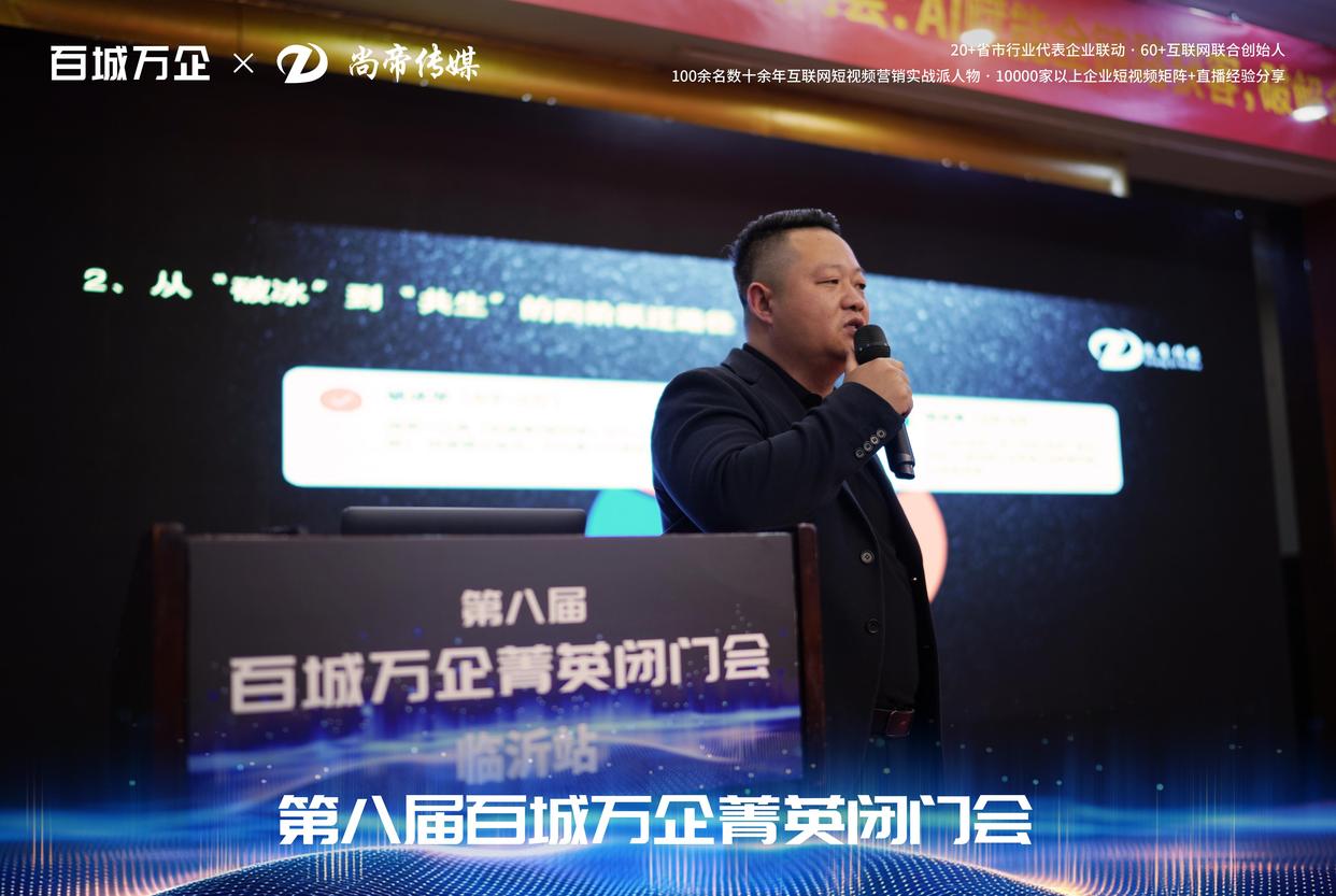临沂,2025年11月2日– 在第八届百城万企菁英闭门会(临沂站)次日,尚帝传媒创始人王友贺先生为与会企业家带来了一场题为《全域整单营销:从工具贩售到赋能共生》的深度分享。本次分享摒弃了传统的理论说教,直击企业营销痛点,系统性地拆解了如何通过思维跃迁、精准筛选与价值交付,实现从单一产品销售到为客户提供全域解决方案的转型升级。