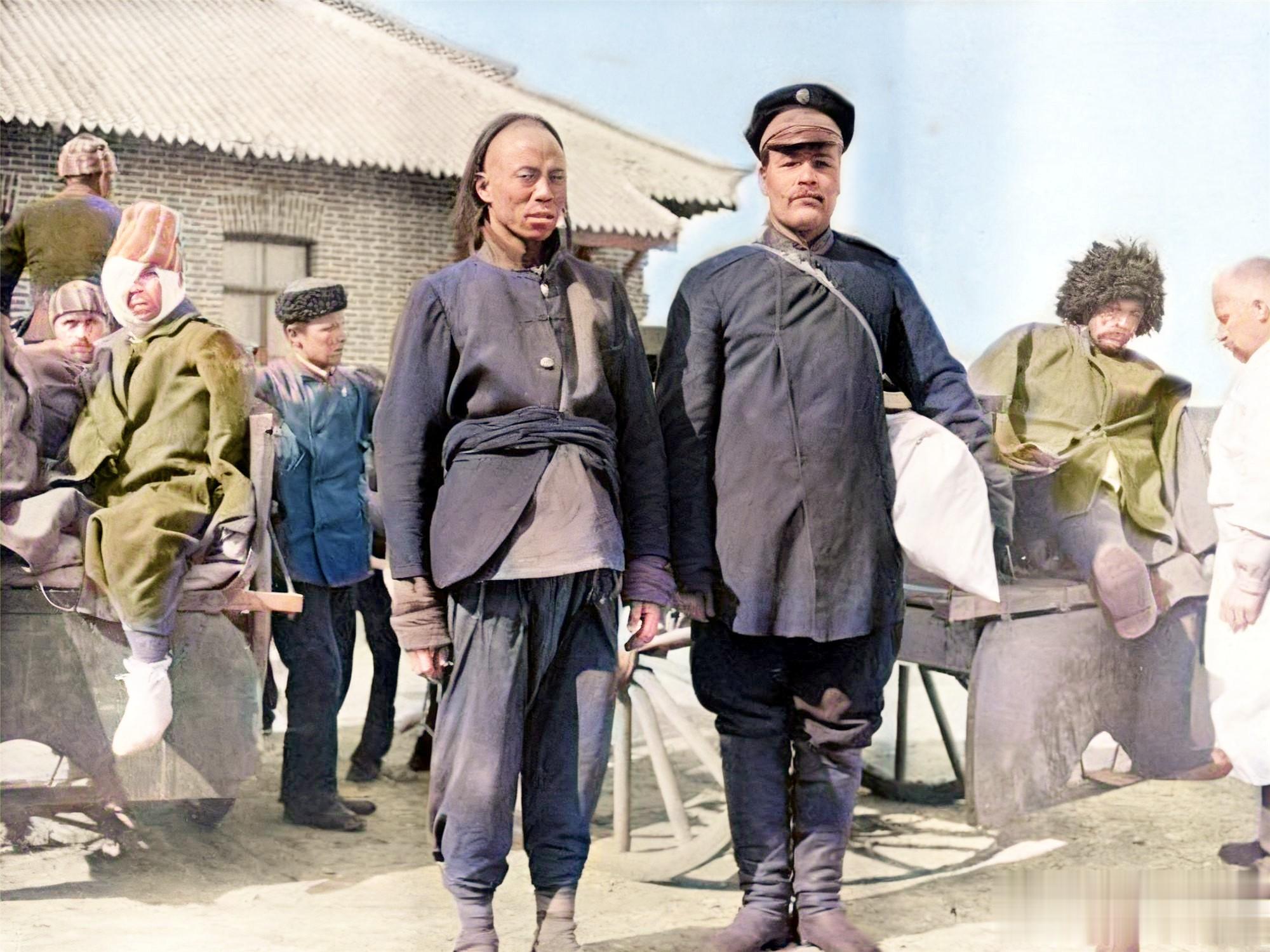 谋克敦火车站内,一名披头散发的中国百姓和一个抱着邮包的俄国邮差合影,在他们身后,是从前线撤下了的俄国伤兵,其中一个脑袋和脚上都裹满了绷带,神情沮丧又滑稽。