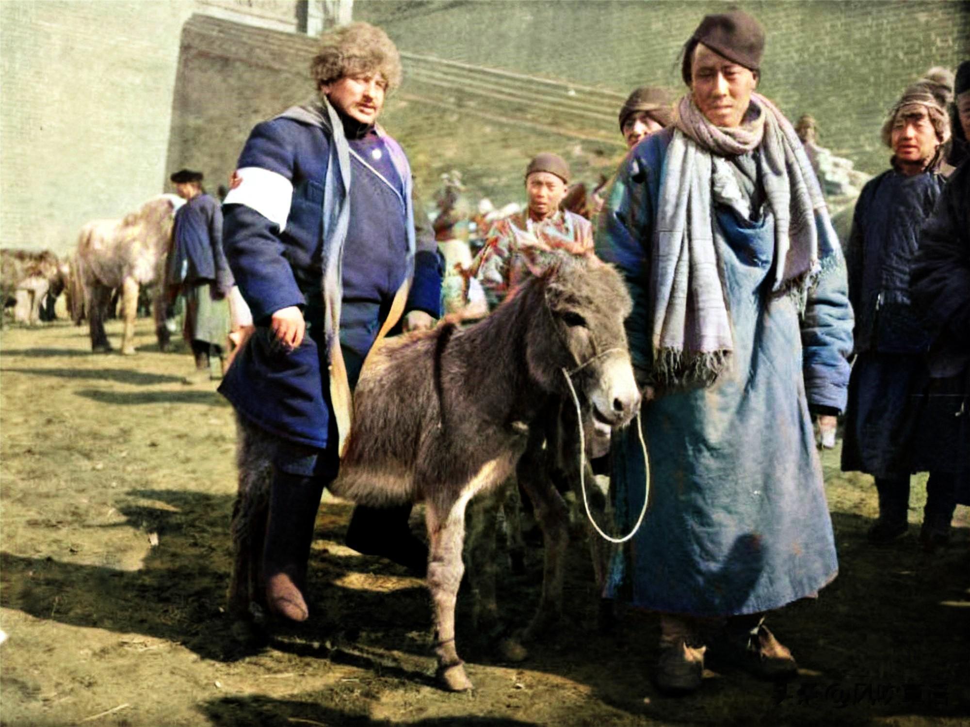 在集市上,摄影师骑上了一头小毛驴,驴夫站在旁边牵着缰绳。摄影师手臂上戴着白色袖标,表明是一名红十字的工作者,他穿着厚厚的棉衣,身体非常壮硕,胯下的毛驴身材矮小,让人看着心痛。