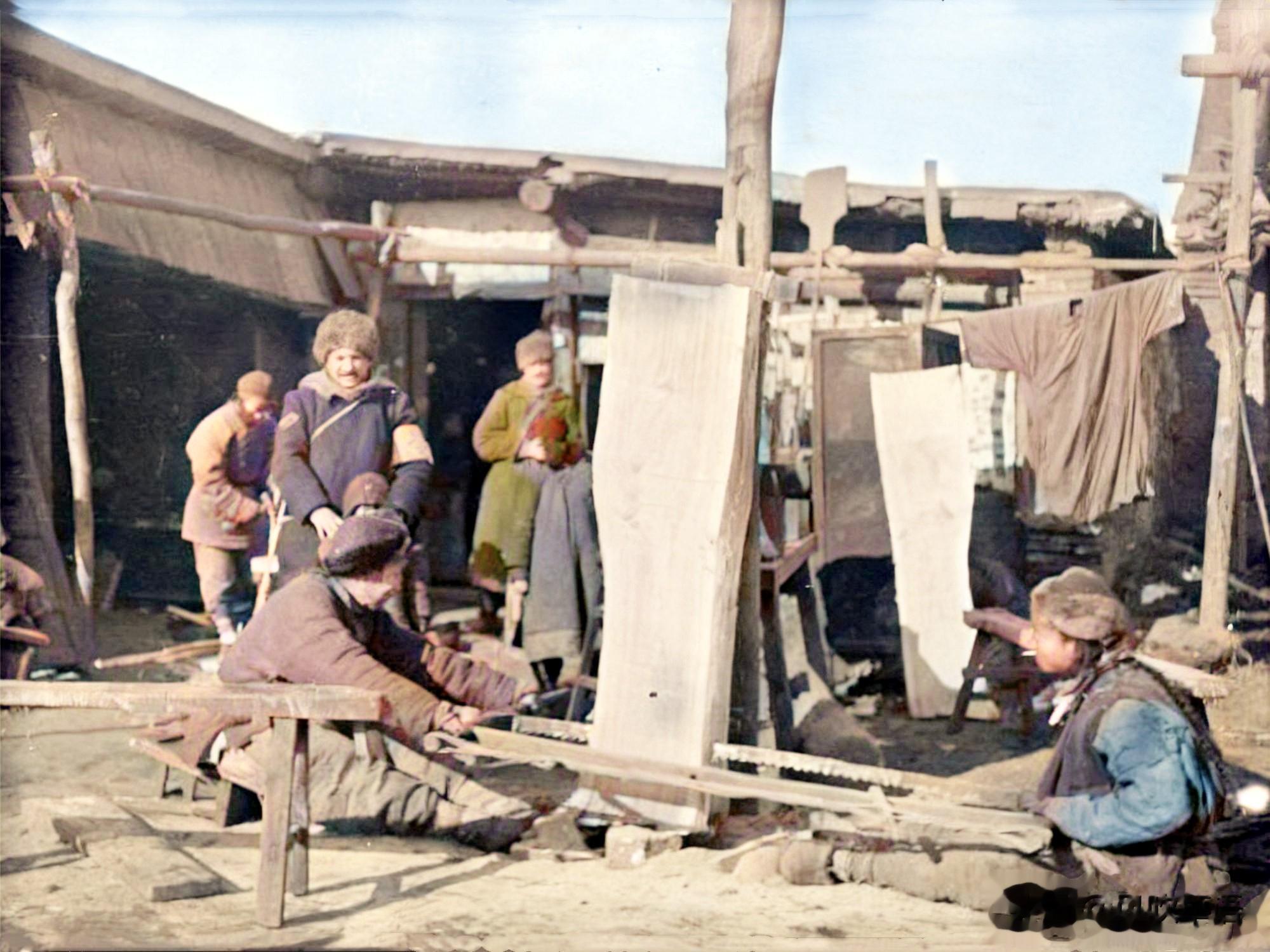 摄影师来到车站附近一个制作枕木的作坊内,两名苦力坐在地上,正操作着大锯合力将木头破开,其中一个苦力嘴巴里还叼着纸烟,苦中作乐。在他们旁边,挂着一件晾晒的长衫,说明平日他们就住在这里。