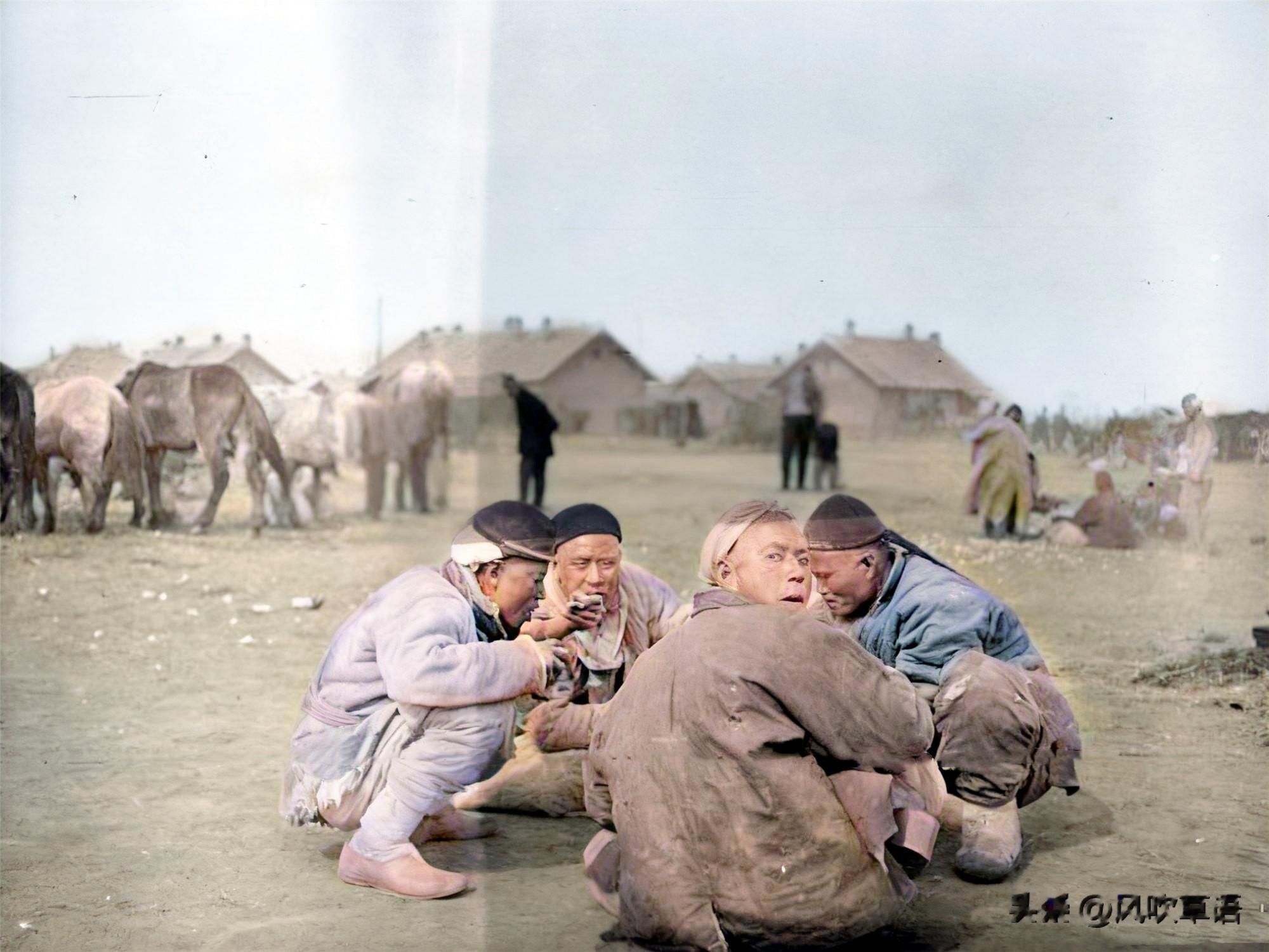 几名苦力正围在一起蹲着吃饭,一名男子从同伴口中得知身后站着摄影师,正在扭头观望。 他们或顶着毡帽,或裹着头巾,从这身打扮看,大概率是 “闯关东” 的关内百姓。为了生存,他们干着最苦的活,吃着最简单的食物。