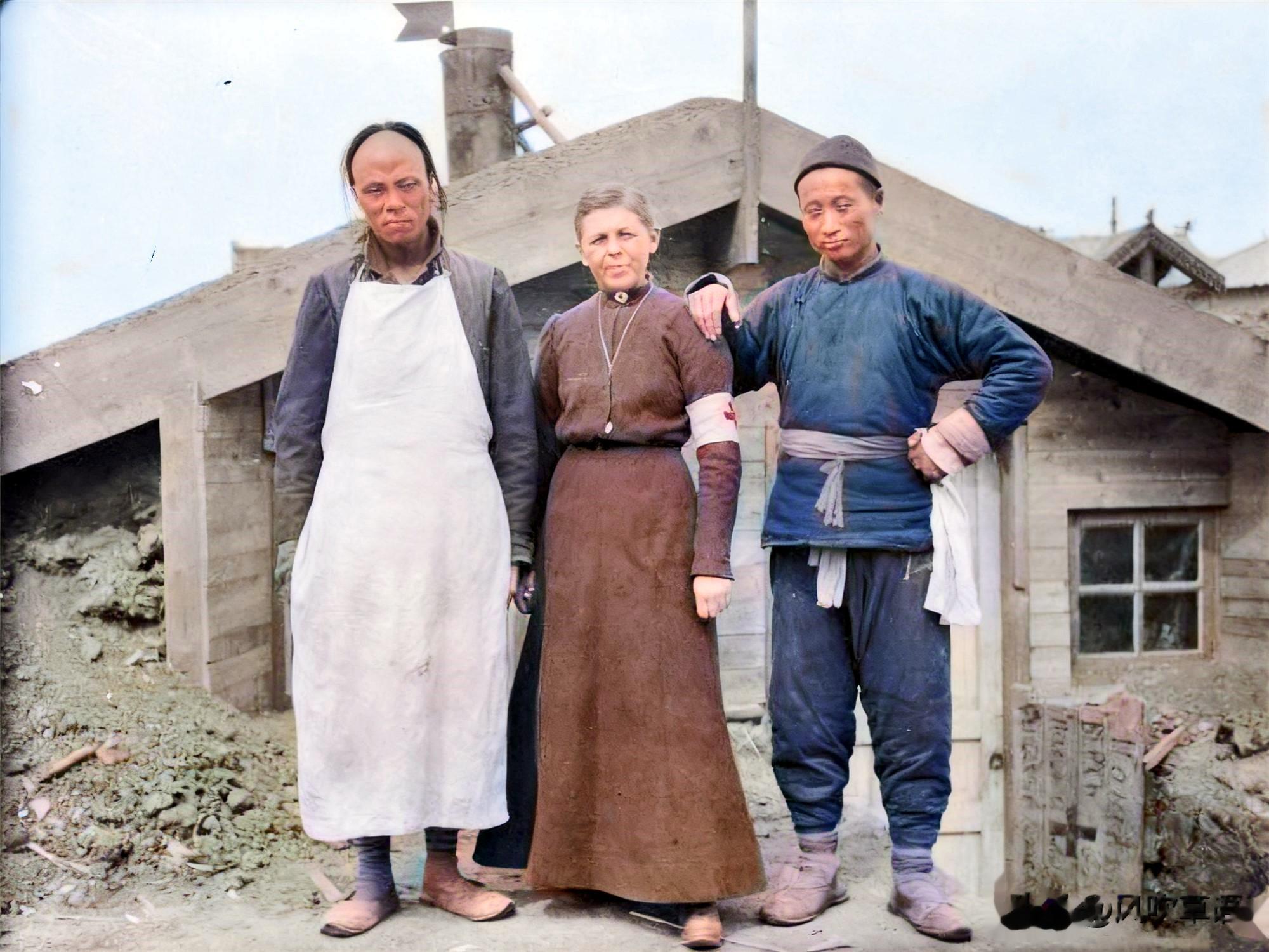 上图中的两名中国男子和一位洋人女护士的合影,女护士同样戴着的白色袖箍,当我们把两张照片进行比较时,发现两名中国男子的身体动作基本保持着原来的样子,唯一的变化是图右的男子扎起腰带,还奓着胆子把一只手搭在了女护士的肩膀上。这种情形在当年十分罕见。