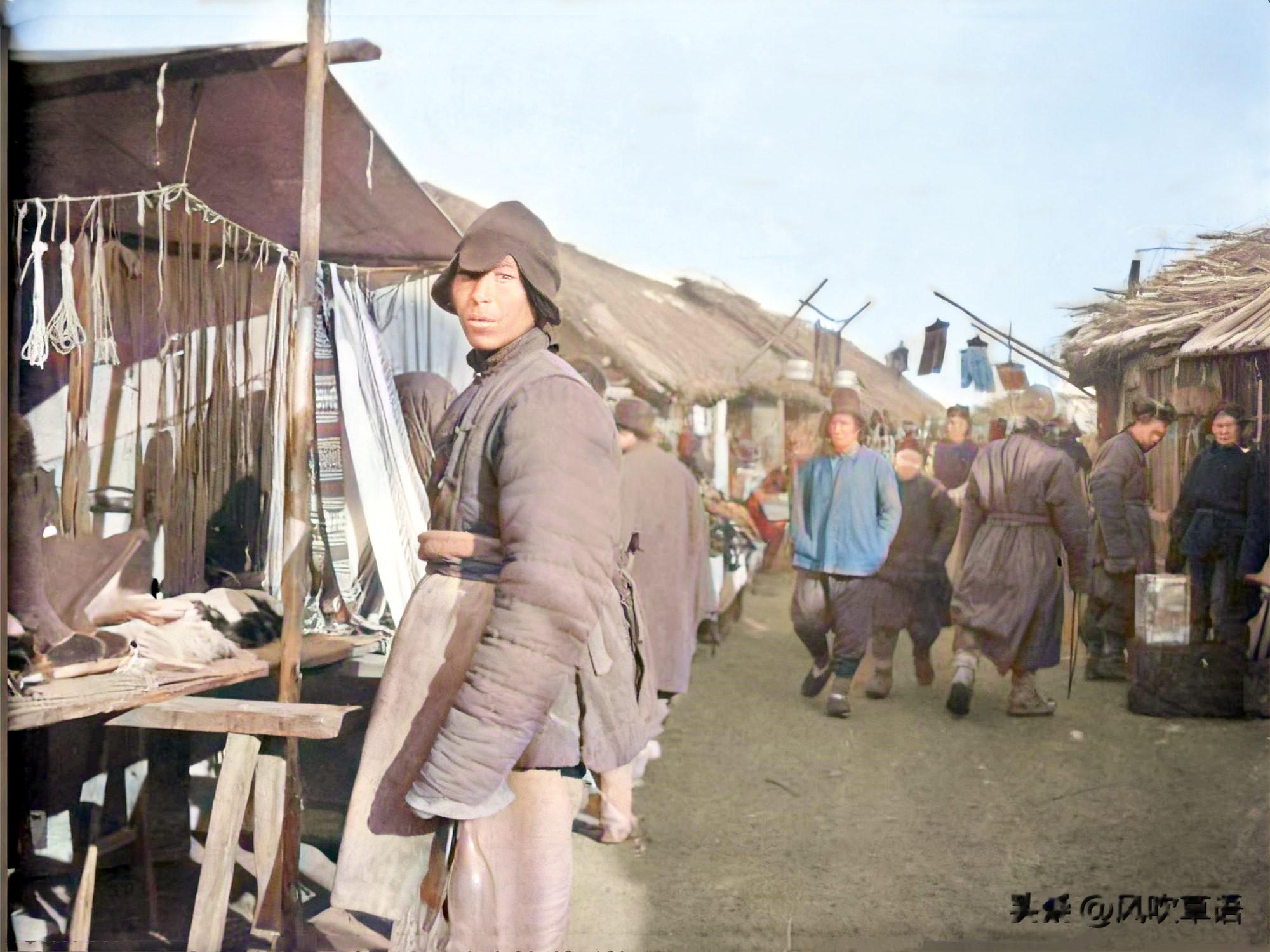 两名俄国男子站在村街边交谈,身后的茅草屋顶上还留有残雪。清末时期,随着中东铁路的开通,大量外国侨民和商人涌入奉天,即便是在乡村集市上,也能轻易看到他们的身影。