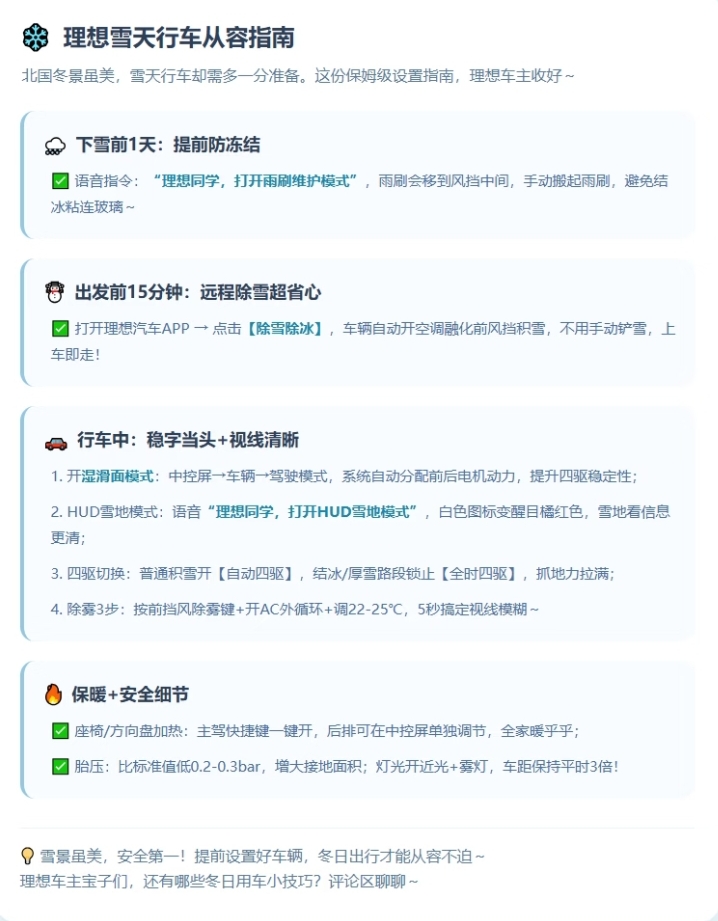 理想车主宝子们,还有哪些私藏的冬季用车小技巧?评论区分享一下~ 收藏起来,下雪直接用!