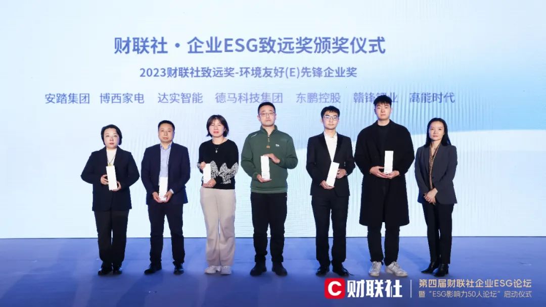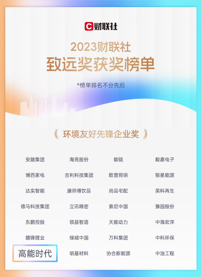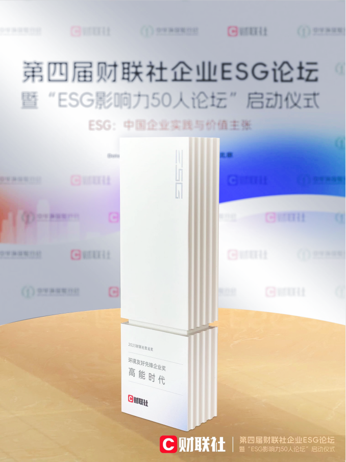 2023年12月27日,第四届财联社企业ESG论坛在北京举行,来自各行各业的政商学界领军人物,共同探讨ESG话题,为中国企业的可持续发展提供借鉴和启示。期间,ESG企业评选结果同步揭晓,高能时代凭借在全固态电池和推动可持续发展领域的突出表现,荣获“2023财联社致远奖·环境友好先锋企业奖”。