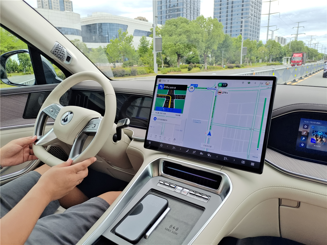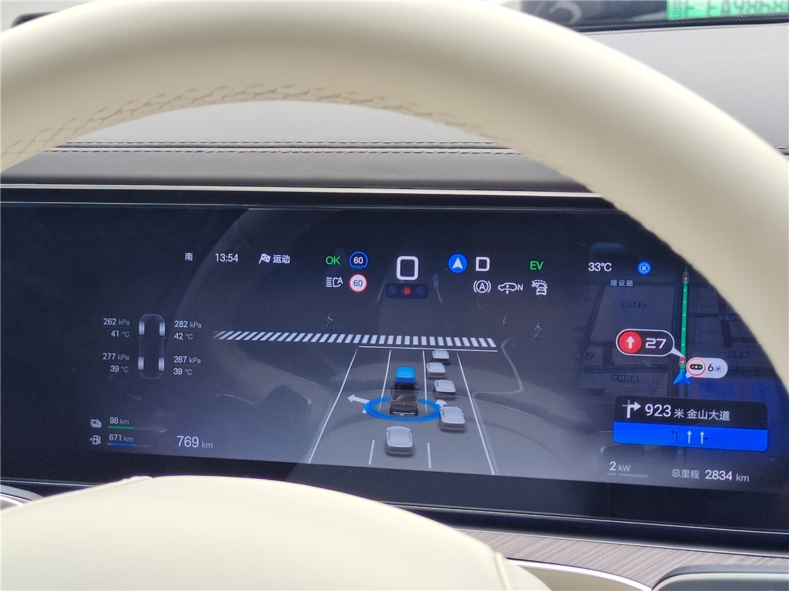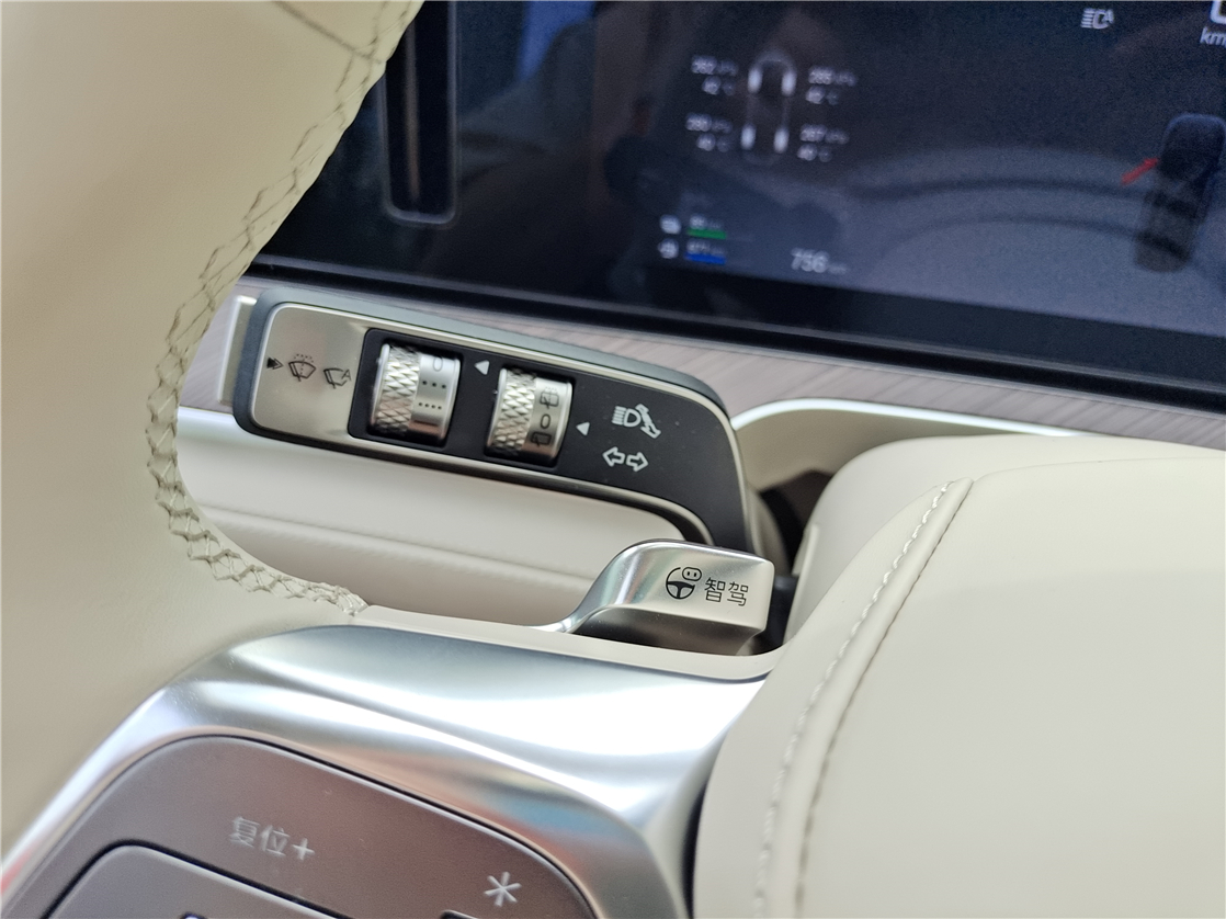 开启智驾的方式也很简单,通过方向盘背后的“智驾”拨片即可一键启动或通过语音指令“你好,腾势”唤醒后说出“开启智能领航”,系统就会自动激活。需要提及的是,智驾过程中也需要手扶方向盘并时刻关注行驶环境,长时间双手脱离方向盘车辆会通过语音、屏幕文字等提示驾驶人,提示之后无操作就会退出辅助驾驶并减速、打开双闪、鸣笛,直到安全停车。