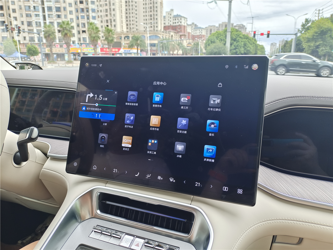 随后进行了道路智驾体验,我们驾乘的是一台超5.2米长的“巨无霸”级大六座车型——腾势N9(旗舰型),其搭载的是天神之眼B-智能驾驶辅助激光版(DiPilot 300),动力方面则采用的是2.0T+三电机组成的插混动力,参数方面比之竞品有很大优势。