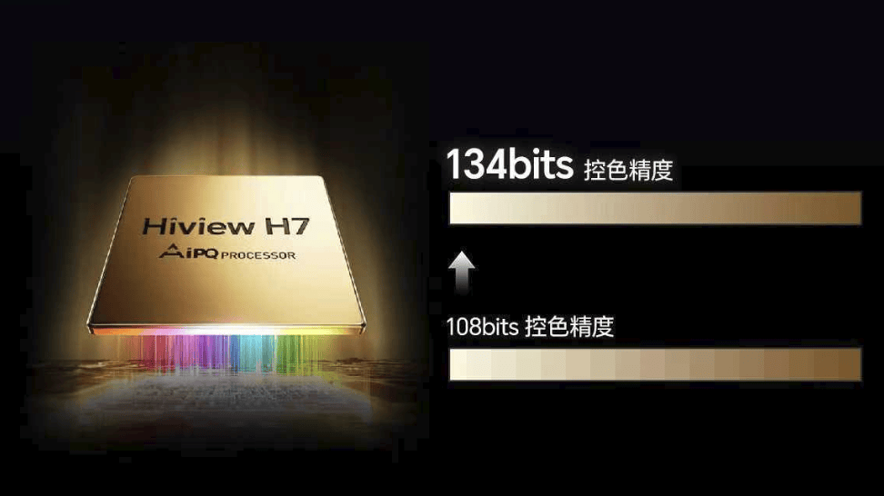 这就不得不提海信的另一张王牌——最新一代信芯AI画质芯片H7。这颗芯片,就是驾驭“玲珑4芯”架构的“超级大脑”。为了驯服四基色背光,海信直接把芯片的控色精度拉升到了行业最高的134bits。这是什么概念?做个直观对比:当前QD-OLED的控色精度大概在30bits左右,而很多普通Mini LED电视甚至没有独立的控色芯片,更谈不上精准控色。