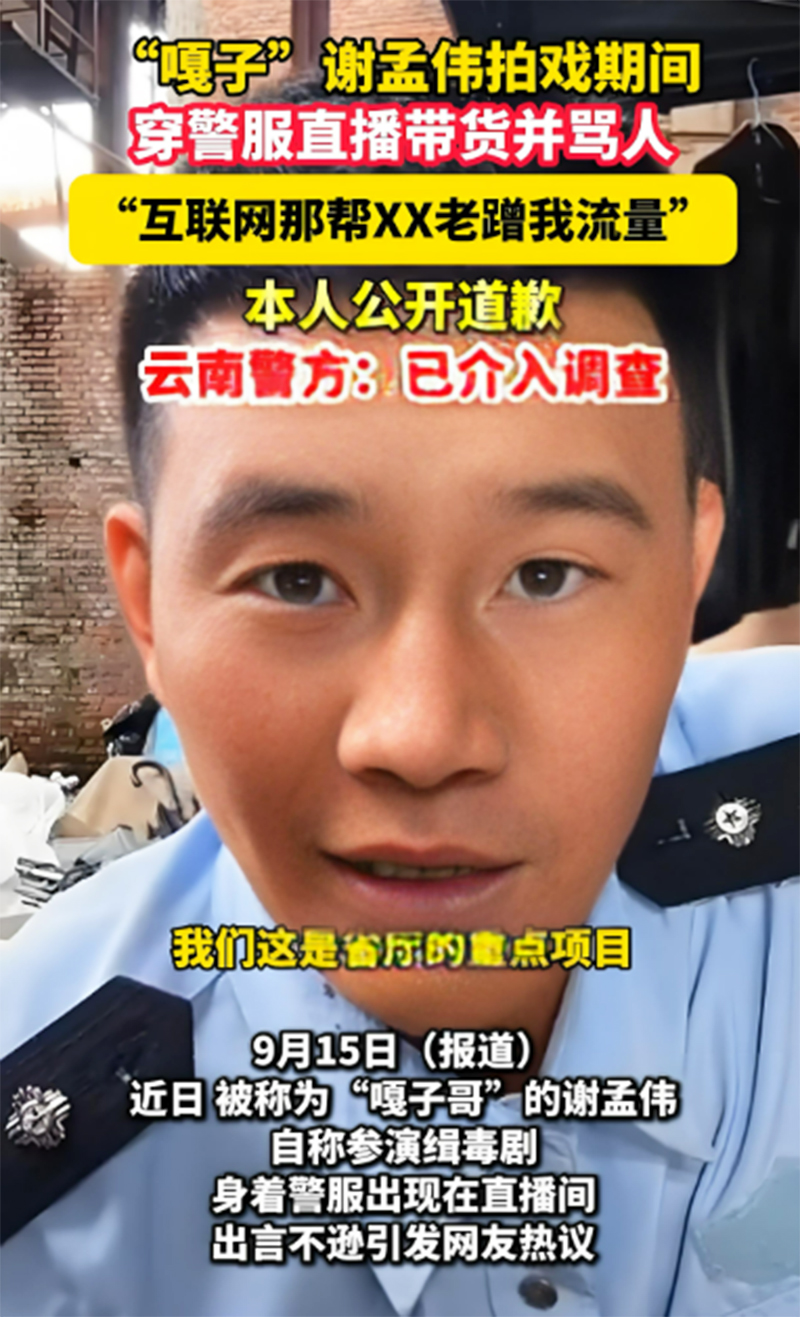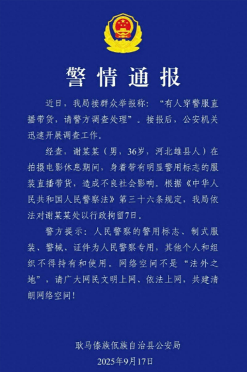 9月17日,云南警方表示近期接到群众举报,称有人穿警服直播带货。经过调查之后已经核实,“谢某某在拍摄电影休息期间,身着带有明显警用标志的服装直播带货,造成不良社会影响”,最终依法对其处以行政拘留7日。