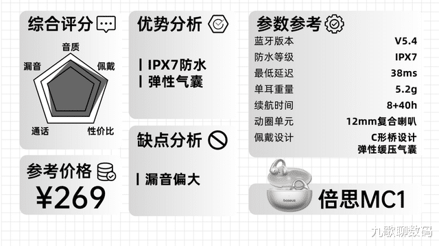 C 形软桥搭配弹性气囊贴在耳廓上,轻盈无压感,久戴也不会觉得夹耳,稳固性不错,只是剧烈运动时偶尔会轻微晃动。音质上中高频还算清晰,人声听着通透,满足日常听歌、播客够用,但漏音问题比较明显,音量稍大旁边人就能听见内容。功能配置里防水等级很亮眼,运动出汗或淋雨都不用怕,蓝牙连接稳定,实体按键还能避免误触,通话降噪也能过滤不少杂音。整体表现有亮点也有遗憾。
