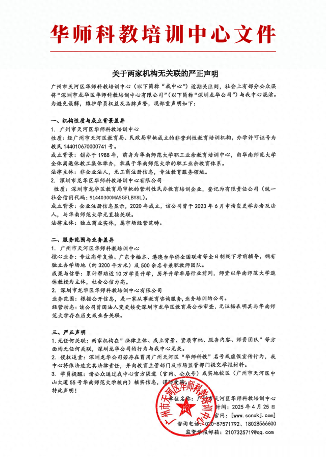 1.无任何关联:两家机构在”法律主体、成立背景、资质审批、服务内容、师资团队”等方面均无任何关联,深圳龙华公司的行为与我中心无关。2.侵权追贵:深圳龙华公司若存在冒用广州天河区“华师科教”名号或虚假宣传行为,我中心将依法追究其法律责任,并向教育主管部门及市场监管部门提交举报材料。3.学员提醒:请公众通过我中心官方渠道(官网、公众号)或实地校区(广州市天河区中山大道55 号华南师范大学校内)核实信息