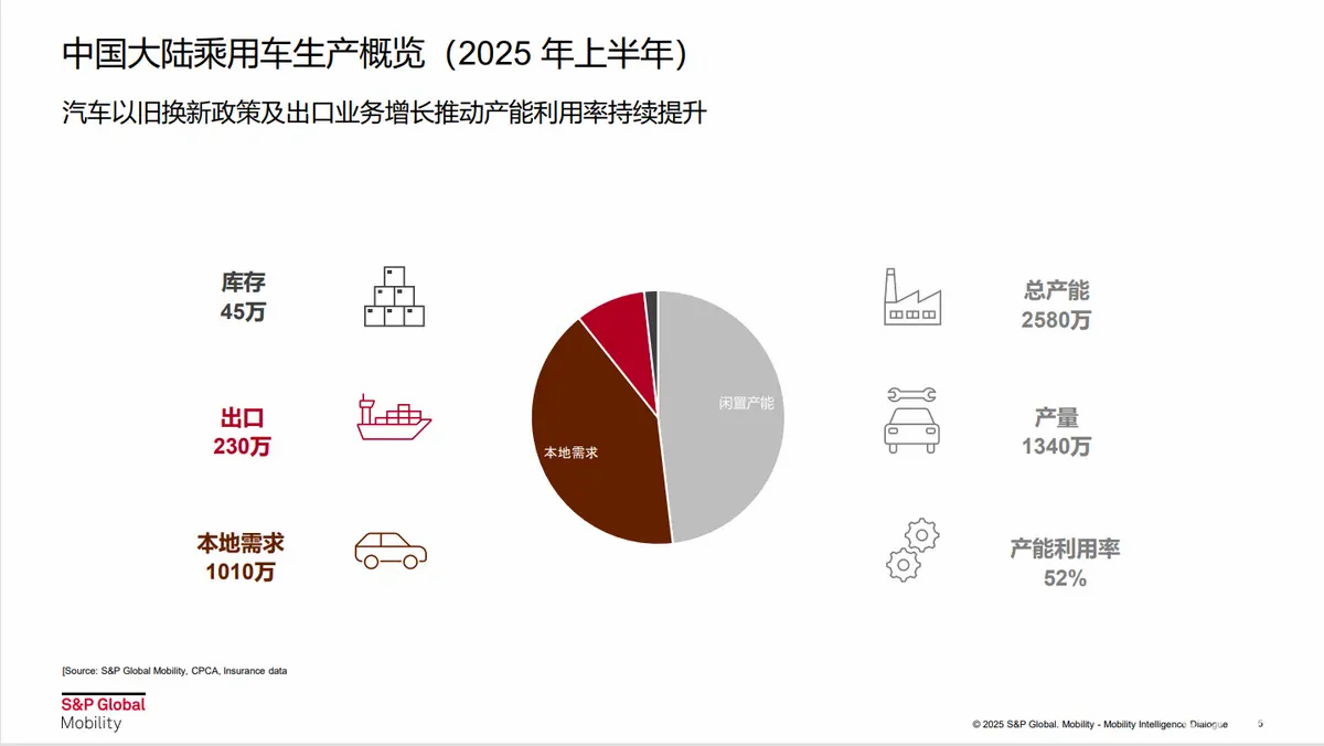 标普全球汽车大中华区汽车分析联合总监陶杲在演讲中提到,尽管今年上半年中国汽车销量同比增长11%,但销售额增幅仅为0.8%,激烈的价格竞争严重挤压了企业利润。当前,中国汽车市场面临着需求不足和产能利用率低(约50%)的双重挑战,这使得海外市场成为中国车企寻求新增长动力的关键出路。