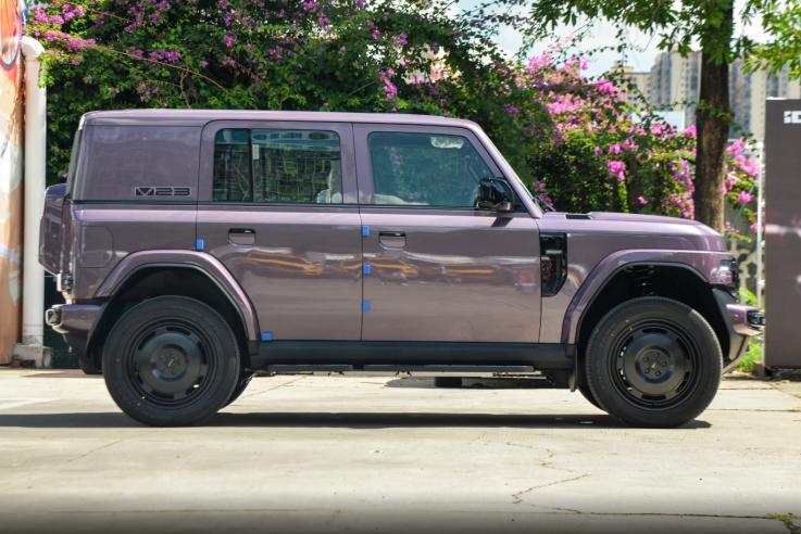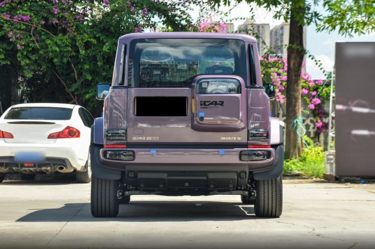 而在我看来,iCAR V23之所以惹眼,还有一个关键因素来自其与众不同的车身比例。整车长宽高对应4220(4249)x1915x1845mm,轴距2735mm,接近1:1的宽高比搭配19英寸或21英寸复古大饼轮毂,营造出越级的体量感和视觉冲击。同时,整车在空载状态下的离地间隙也较为可观,四驱版在200mm左右,接近角42-43°,离去角40-41°,涉水深度达600mm,虽然硬件参数实力比不过一些专业硬派越野车,但也具备了一定的轻度越野能力。