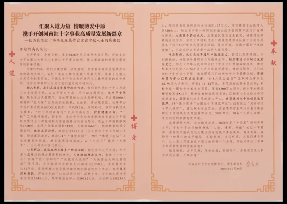 河南省红十字会在感谢信中写道,创新设立“河南省红十字人道奖”,开展群团领域先进典型推荐评选,旨在典型引领、凝聚人道力量。禹爽院长获此殊荣,既是对过往公益实践的褒奖,也意味着更高标准的自我要求:在推进中国式现代化建设河南实践中,医疗机构应当把公益责任扛得更实,把优质资源下沉做得更深,把“救在身边”体系参与得更主动。