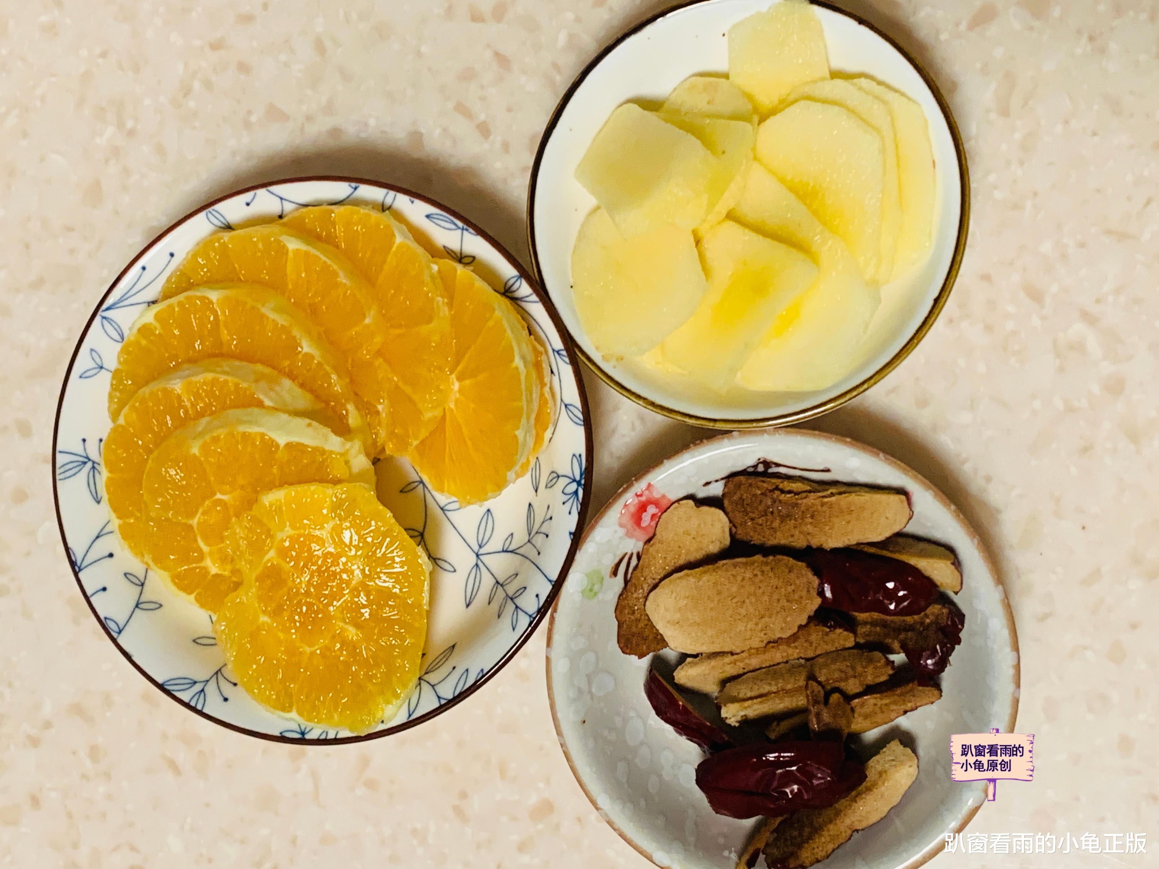 1:将橙子和苹果分别洗净后削去外皮,切片;大枣洗净后去核切片备用。【此步注意:橙子把皮和白丝多去掉一些,免得煮出来味苦。这里加了苹果也是一方面缓解橙皮的苦涩,另外也能增加果香味。】