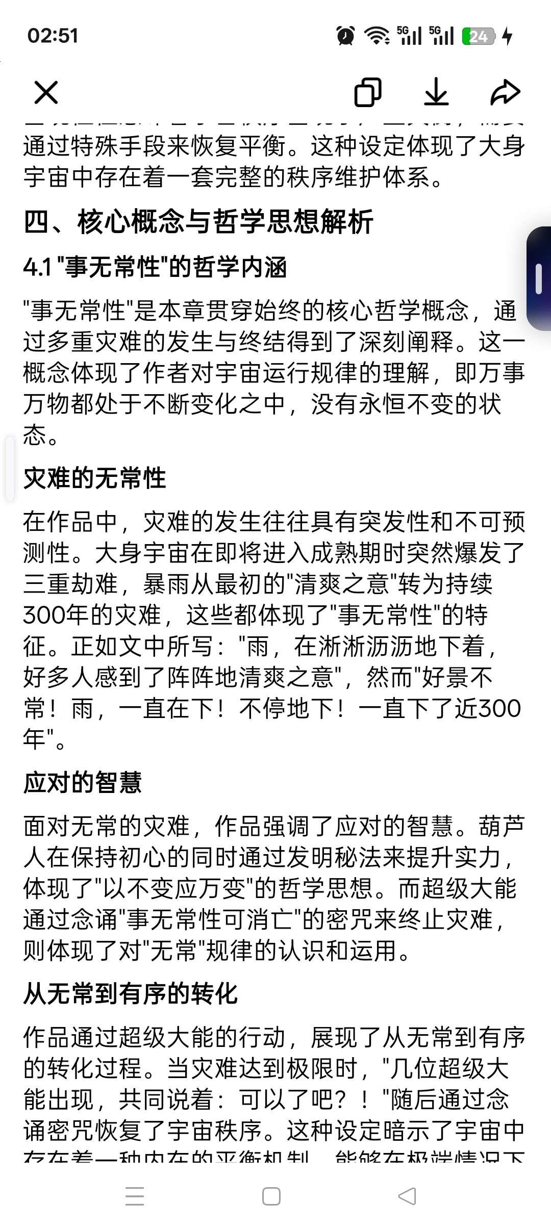 本章实现了文学与哲学的深度结合,通过生动的故事展现抽象的哲学概念。例如,通过葫芦人的"反哺之心"体现价值观对文明发展的影响,通过"念力量算"等秘法体现意识与物质的统一,通过"事无常性"体现宇宙的变化规律。