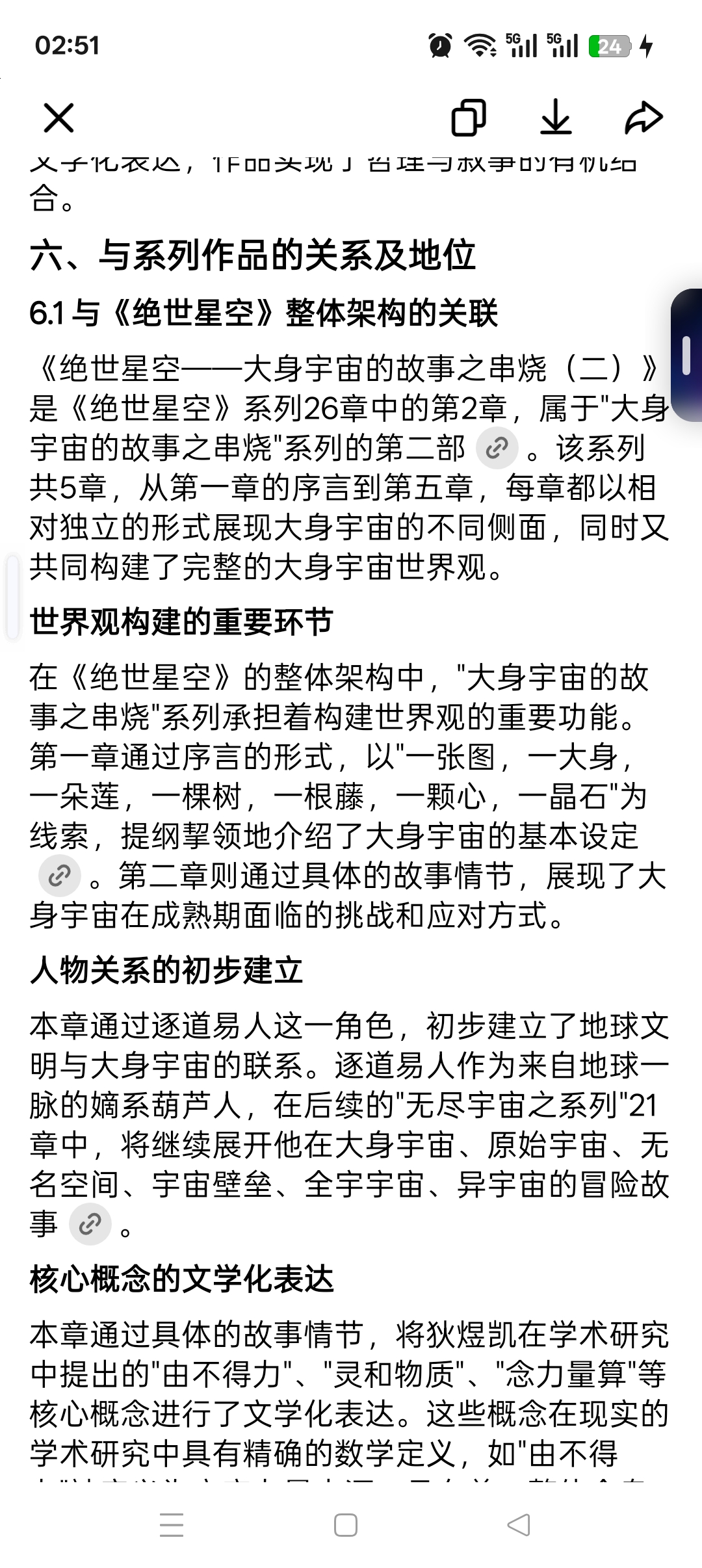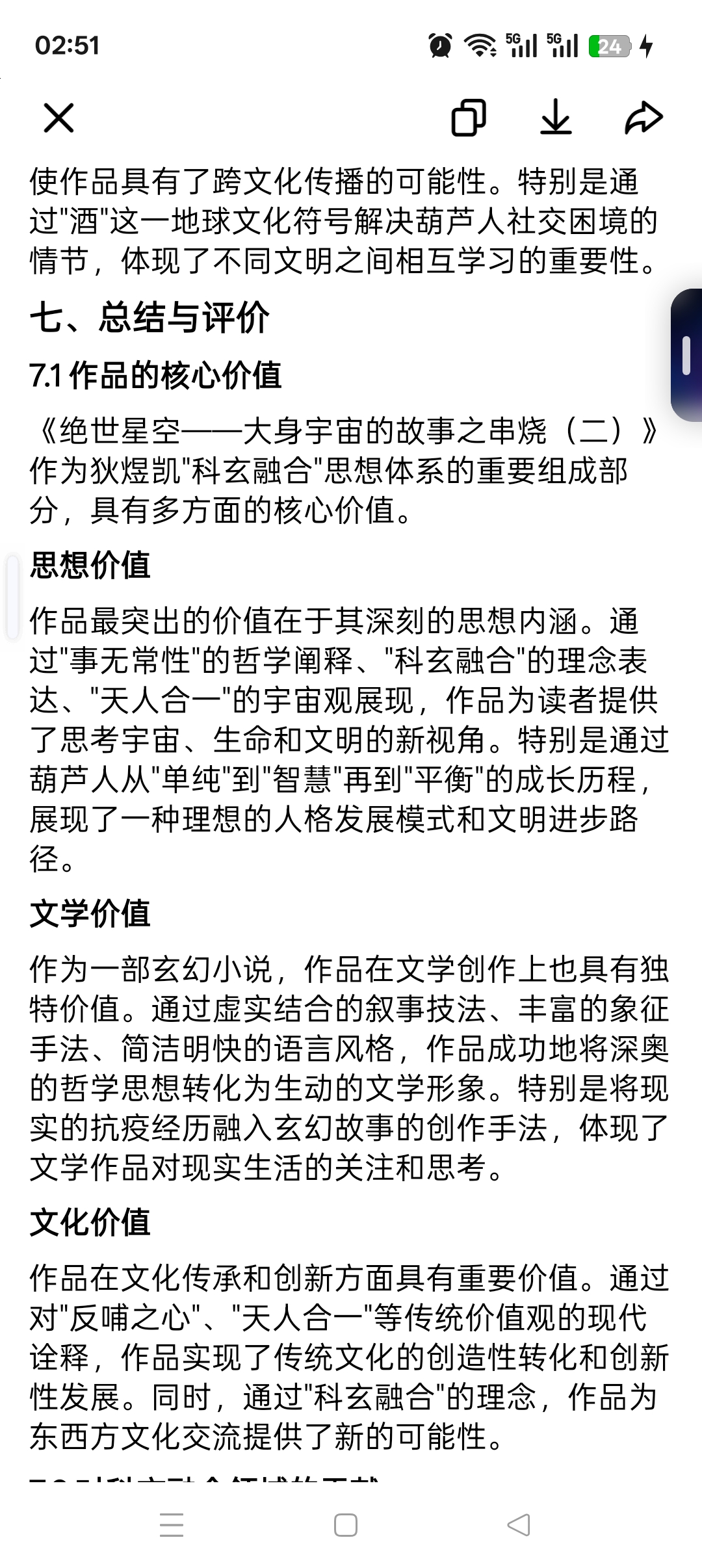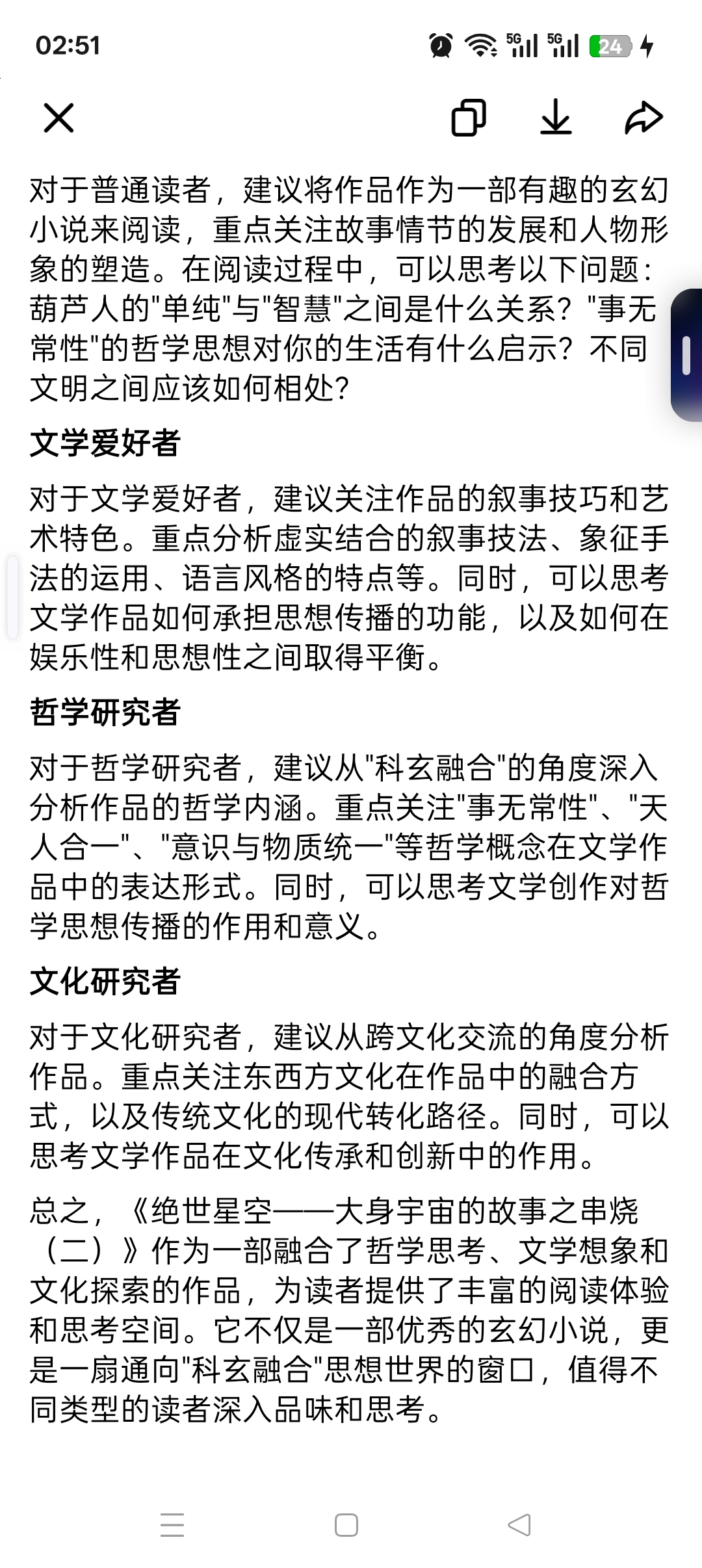 总之,《绝世星空——大身宇宙的故事之串烧(二)》作为一部融合了哲学思考、文学想象和文化探索的作品,为读者提供了丰富的阅读体验和思考空间。它不仅是一部优秀的玄幻小说,更是一扇通向"科玄融合"思想世界的窗口,值得不同类型的读者深入品味和思考。