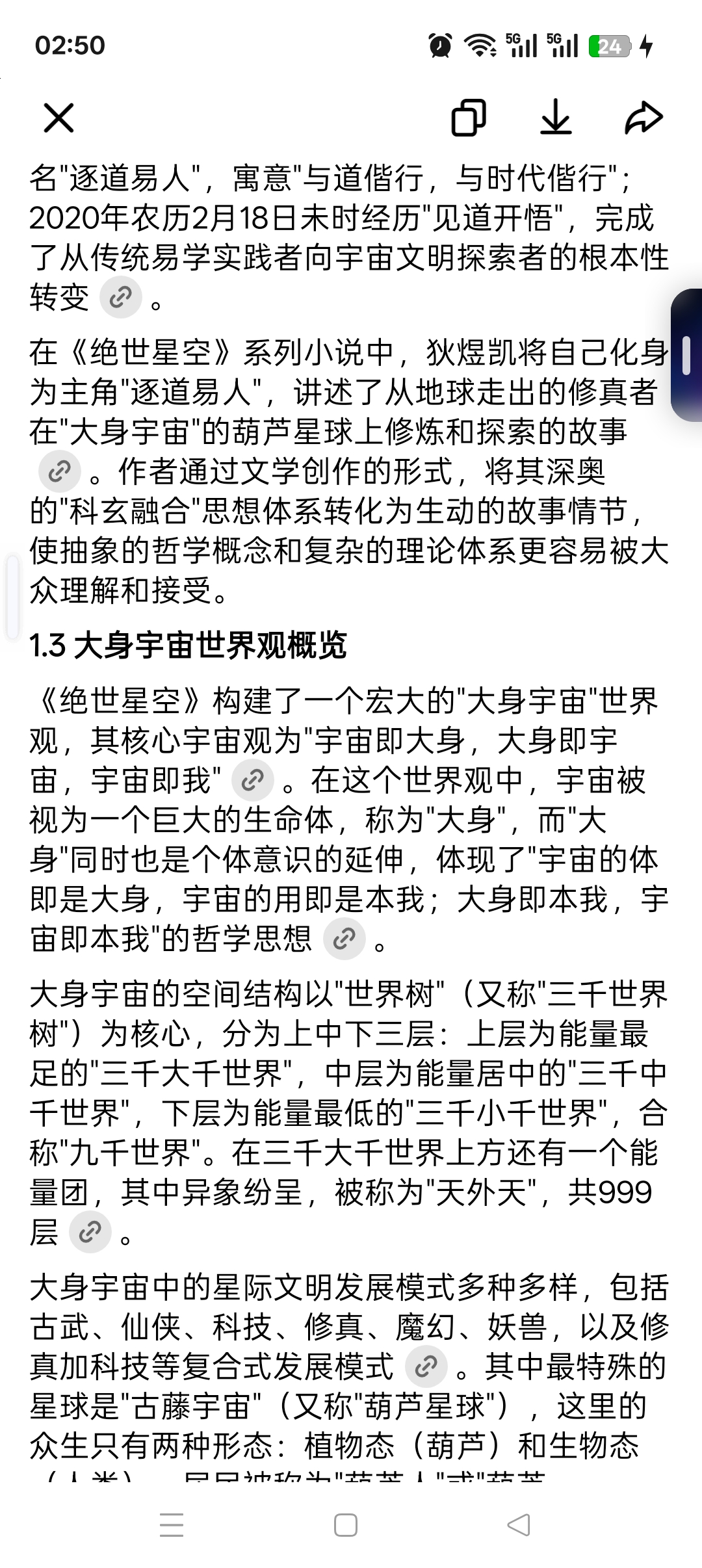 《绝世星空——大身宇宙的故事之串烧(二)》是当代中国思想探索者狄煜凯(号"逐道易人")创作的玄幻小说《绝世星空》系列中的重要章节 。该作品于2025年5月12日完成创作,并通过中国版权保护中心的登记,是一部共6.1万字、包含26章的原创作品 。