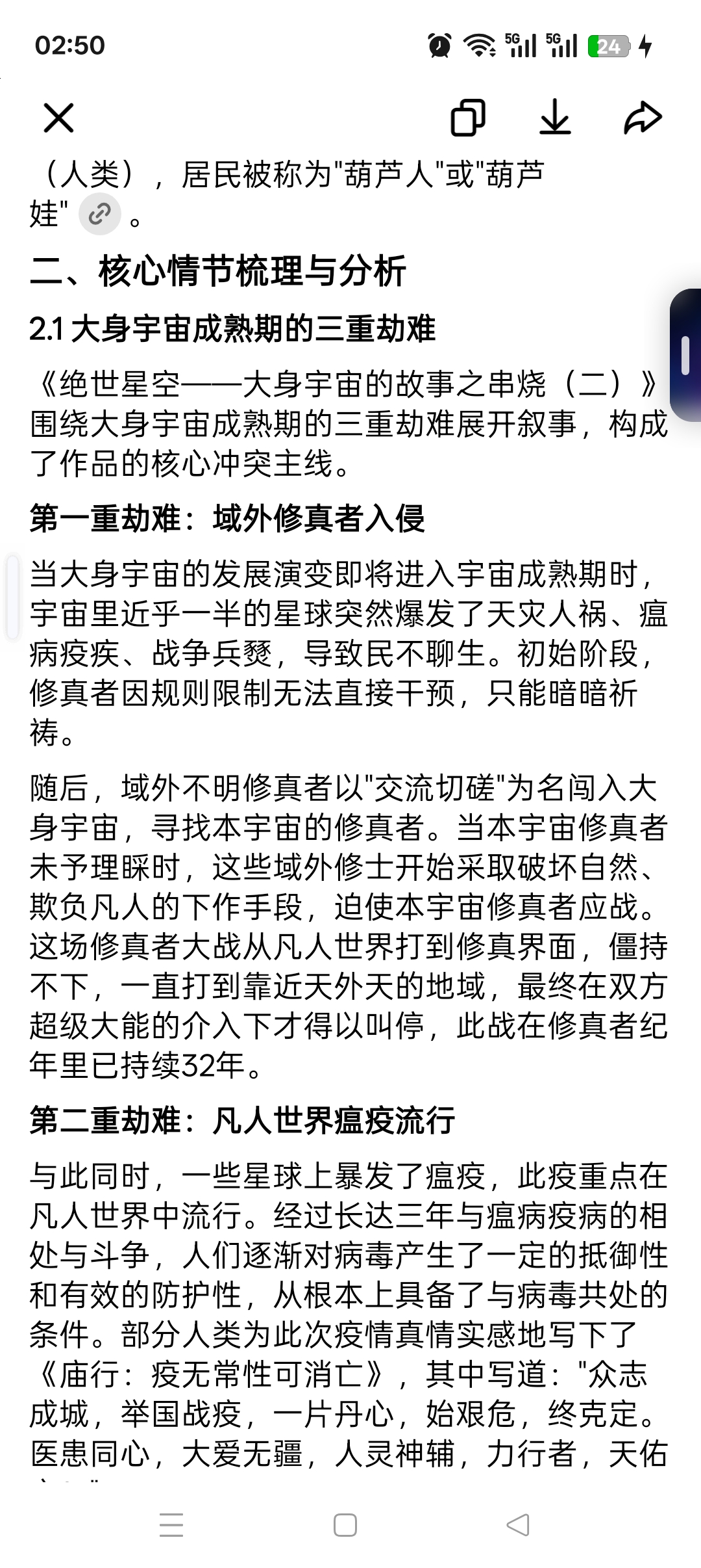 《绝世星空——大身宇宙的故事之串烧(二)》围绕大身宇宙成熟期的三重劫难展开叙事,构成了作品的核心冲突主线。