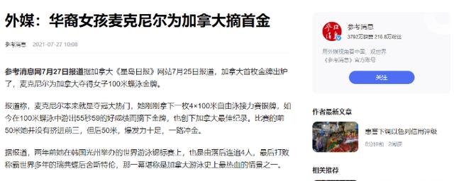 信源:参考消息2021-07-27《外媒:华裔女孩麦克尼尔为加拿大摘首金》