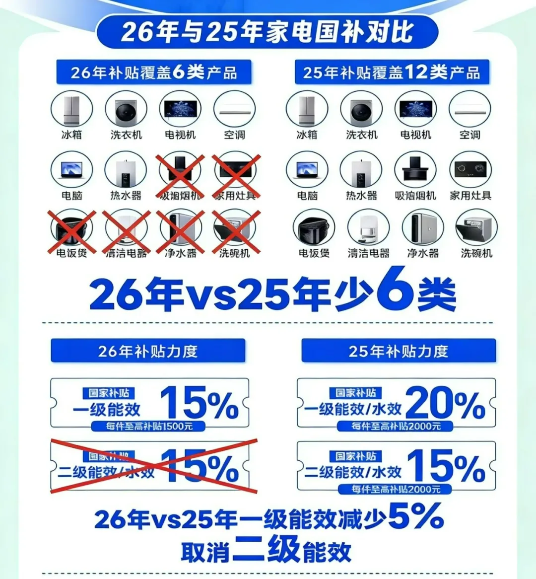 (1)家电补贴:2025 年1 级、2 级能效的都能补;2026 年仅补贴1 级能效 / 水效产品,统一按售价 15% 补贴,单件上限降至 1500 元,意味着想要领补贴就要购买更加绿色高端的产品。