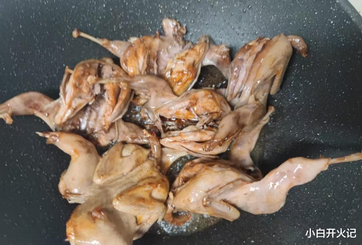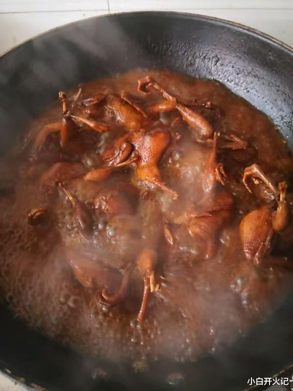 煎好鹌鹑,锅里留底油,冰糖15粒下锅,小火慢慢“哄”。看糖粒从透明变琥珀,泡泡由大变小,颜色一深,立刻把鹌鹑倒回去,翻炒上色,像给它们涂了一层“焦糖滤镜”。接着轮到酱汁天团出场:生抽两勺提鲜、老抽半勺上色、料酒一勺去腥,再请蚝油大哥一勺,增稠挂汁。酱汁裹匀,倒入热水,没过鹌鹑一半,别淹过头,我们要的是“半浴”,不是“游泳”。