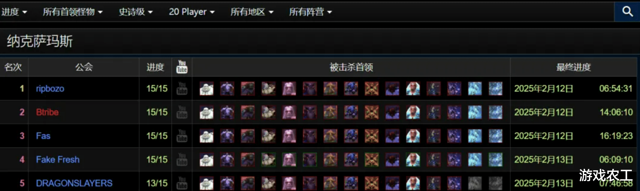 拿下首杀的是ripbozo,而截止目前其实也没有几个公会拿下了首杀,从目前的进度来看整体表现还是比较惨烈一点,尤其是这些队伍们在开荒时候花费的时间相对来说会比较久一些,因为目前最快的开荒记录依旧是6个小时,农工不知道什么时候会有队伍将NAXX英雄模式的时间突破六个小时甚至将时间压到更短。