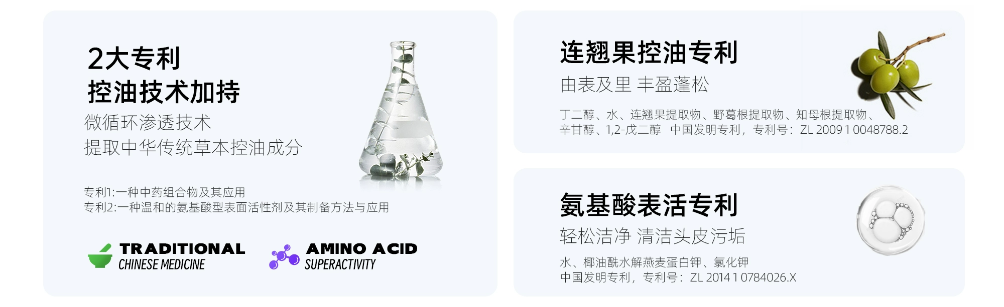 「氨基酸表活专利」:用氨基酸表活代替传统硫酸盐表活,清洁力足够且更温和,能带走头皮污垢、多余油脂,又不会过度损伤头皮屏障。(专利号:ZL 2014 10740268.X)