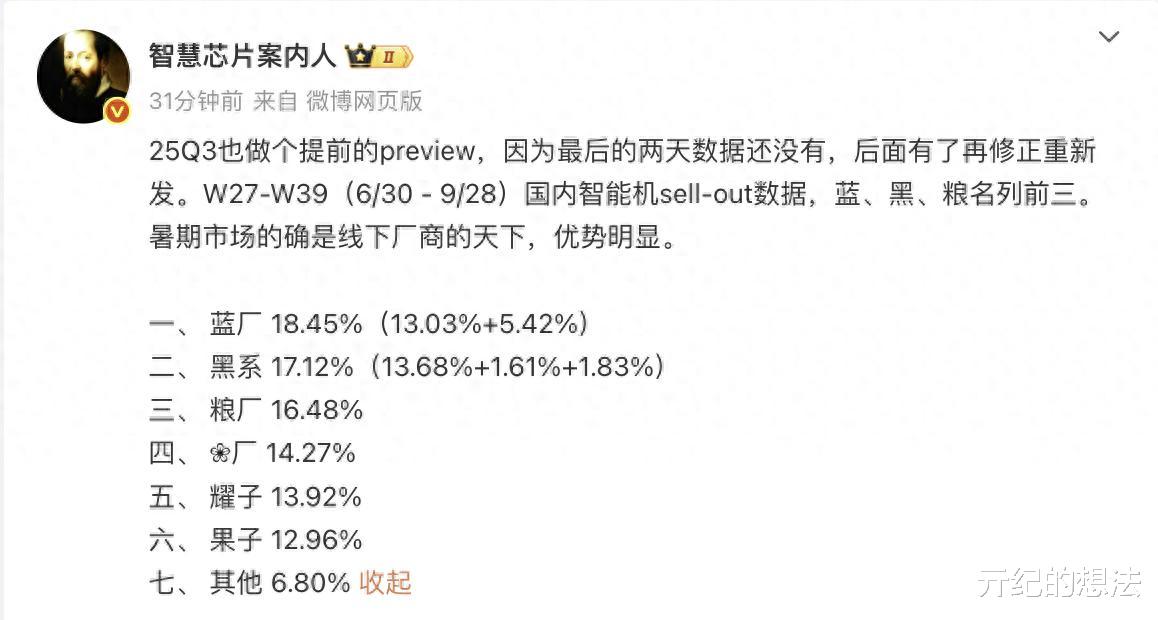 排名第一的是蓝厂,它的市场份额为18.45%,其中vivo的市场份额为13.03%,iQOO市场份额为5.42%。在今年9月初的时候,亓纪就预测蓝厂是第三季度的冠军,原因是7月和8月均排名第一,并且9月初的市场份额也很强势。作为横向对比,2025年前两个季度的冠军依次是华为和小米,第四季度大概率是苹果,所以今年的年度冠军还是挺难猜的。