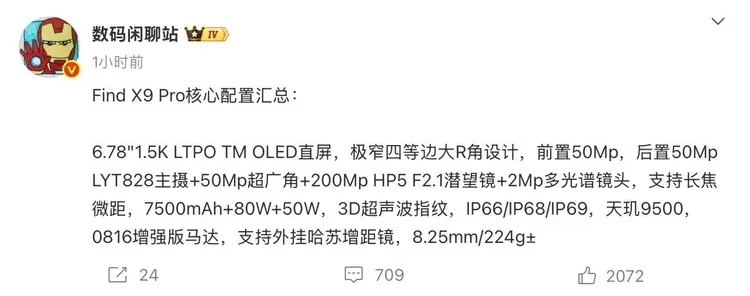 另外,日前,数码博主“数码闲聊站”还曝出了OPPO Find X9 Pro的核心配置,据其称,该机配备“6.78"1.5K LTPO TM OLED直屏,极窄四等边大R角设计,前置50Mp,后置50Mp LYT828主摄+50Mp超广角+200Mp HP5 F2.1潜望镜+2Mp多光谱镜头,支持长焦微距,7500mAh+80W+50W,3D超声波指纹,IP66/IP68/IP69,天玑9500,0816增强版马达,支持外挂哈苏增距镜,8.25mm/224g±”。