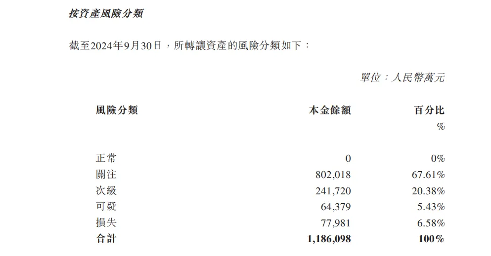 同样,广州农商银行2024年12月甩卖的145.92亿元债权资产中,正常类资产本金余额为0元,占比为0%;关注类资产本金余额为80.20亿元,占比为67.61%;不良资产本金余额为38.41亿元,占比为32.39%。