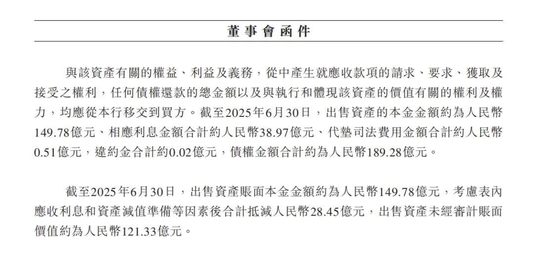 公告披露,广州农商银行上述出售的债权资产为该行持有的信贷资产(贷款),最终成交价约相当于债权总金额的65%。截至2025年6月30日,该行上述出售资产的本金金额约149.78亿元,相应利息金额合计约38.97亿元,代垫司法费用金额合计约0.51亿元,违约金合计约0.02亿元,债权金额合计约189.28亿元。