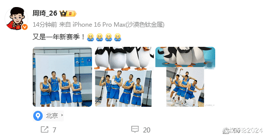 19年男篮世界杯主力!周琦社媒晒新赛季定妆照:与赵睿、方硕翟晓川同框