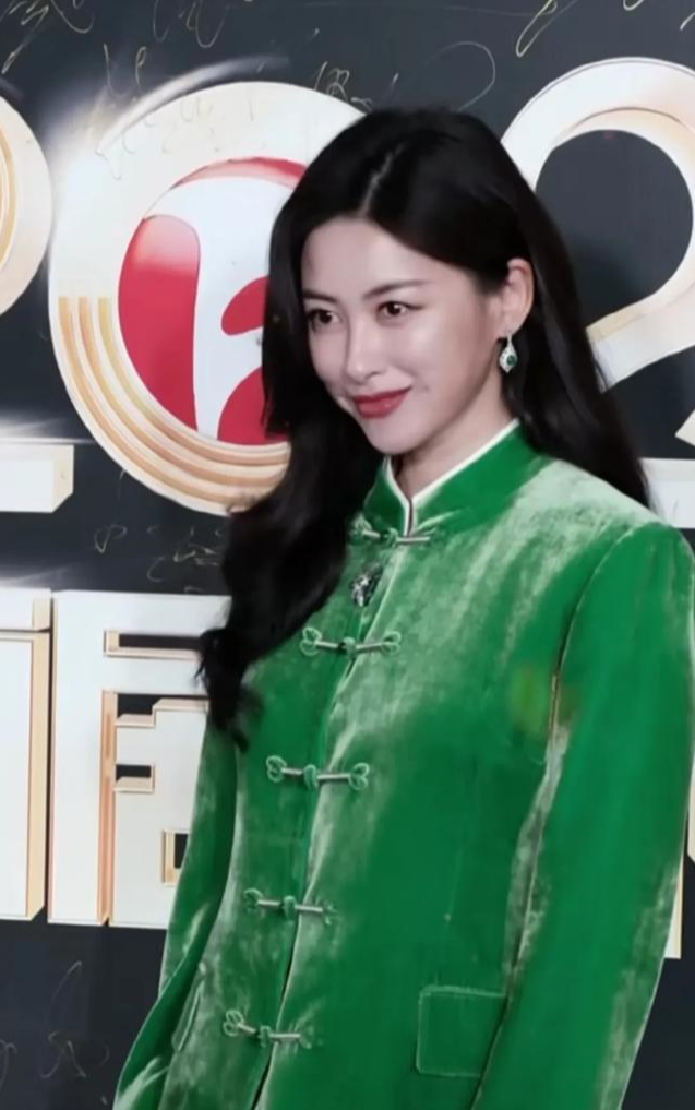 朱珠一身绿色丝绒套装显知性优雅,标志性大波浪造型不失妩媚动人的一面。