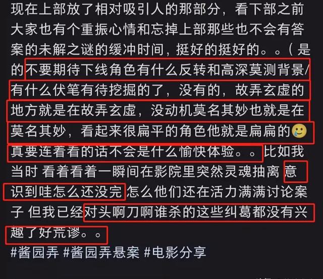 在看了戛纳版的观众看来,《酱园弄》分为上下部也挺好,至少不会又臭又长,他个人感受上部还有8分,下部观影体验只会更糟糕——没有反转、没有伏笔,还在故弄玄虚、莫名其妙,角色塑造更是扁平。