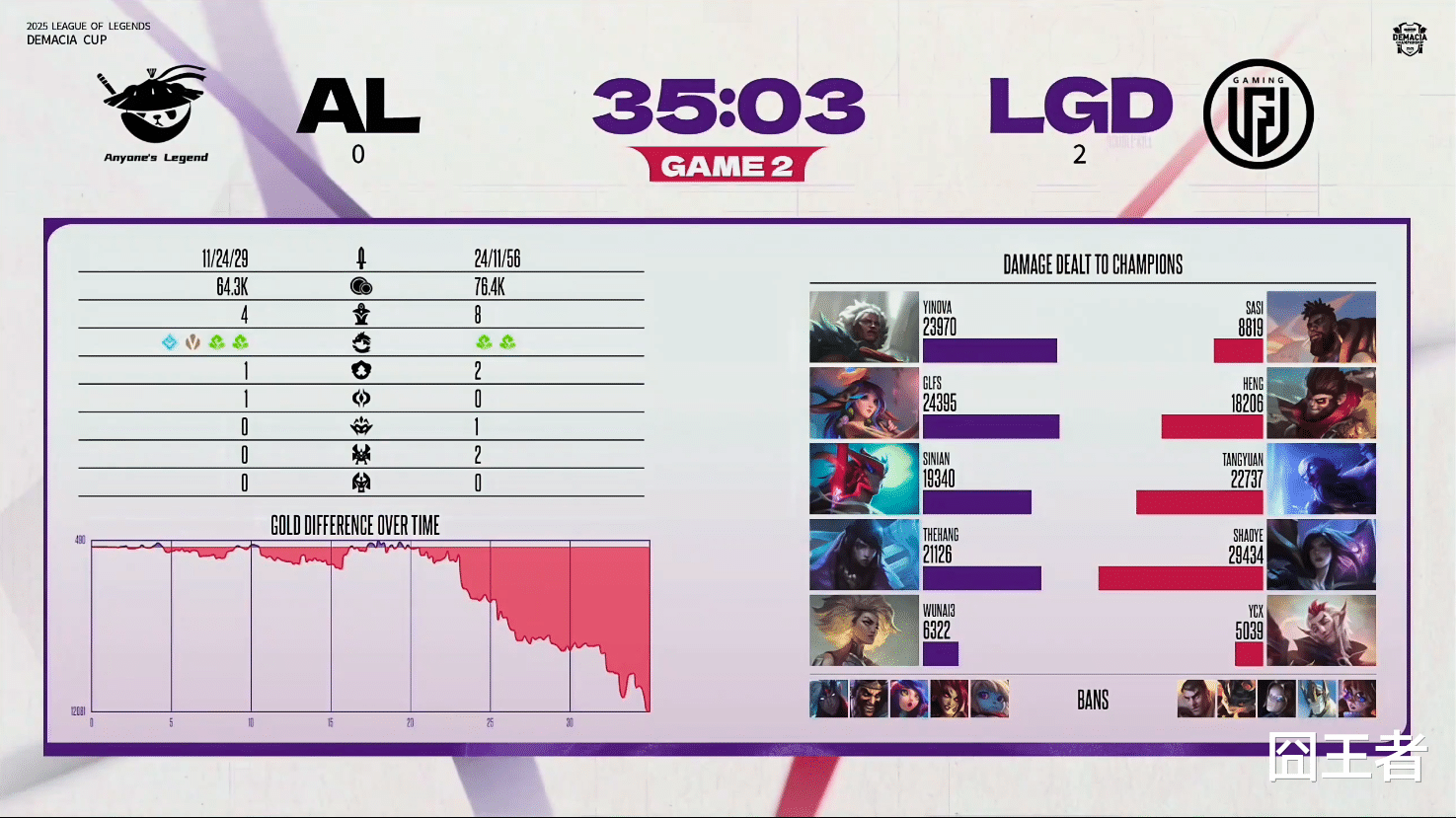 结果第二局比赛,AL放弃了唯一一次反超的机会,让LGD笑到最后。6分钟左右,狼母在上路被越掉;10分钟左右,月男在中路阵亡;13分钟左右,奎桑提在上路阵亡;15分钟左右,AL在野区打出0换2,随后拿下先锋;20分钟左右,瑞兹定住月男,随后LGD拿下大龙;23分钟左右,LGD在河道处团灭AL;25分钟左右,LGD拿下大龙,后续奎桑提被留阵亡,后续LGD反打打出打出1换4;31分钟左右,AL强打大龙反被LGD打出1换4,随后LGD拿下大龙;最终35分03秒,AL率先拿下龙魂,但后续LGD下野收拾残局打出3换5,随后顺利一波,手握三个赛点。