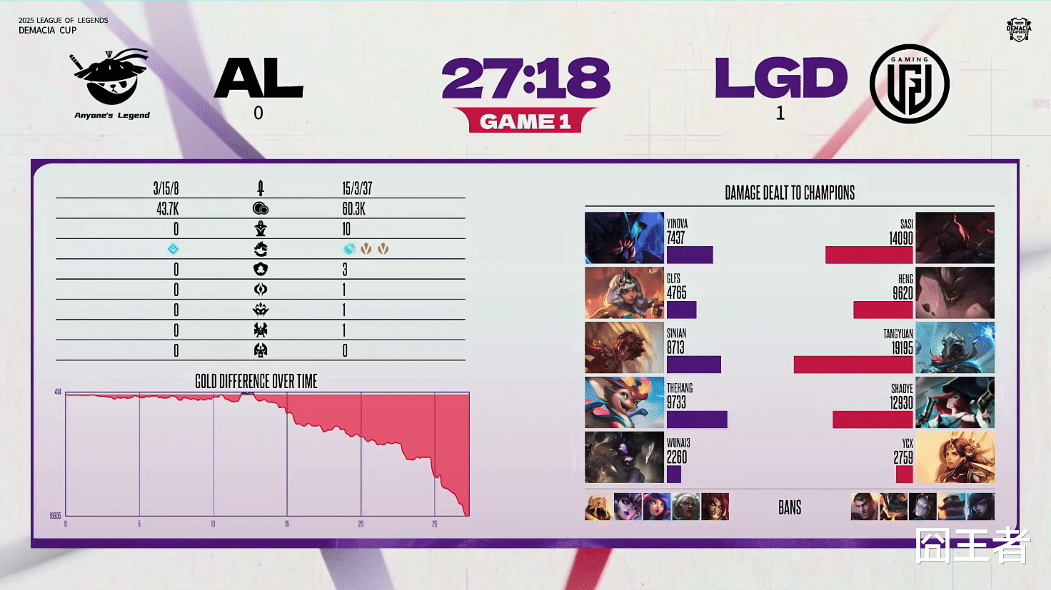 结果第一局比赛,全二队成员的AL,被LGD打成了单方面的碾压局。11分钟左右,岩雀下路逃跑失败给出一血;11分钟左右,AL抢到小龙并击杀LGD野辅;14分钟左右,LGD中野配合野区击杀岩雀;15分钟左右,维克托团战天神下凡,LGD打出1换4;24分钟左右,AL想野区开团却被打出0换3,随后LGD拿下大龙;最终27分18秒,LGD凭借大龙Buff,团灭AL,顺利一波。