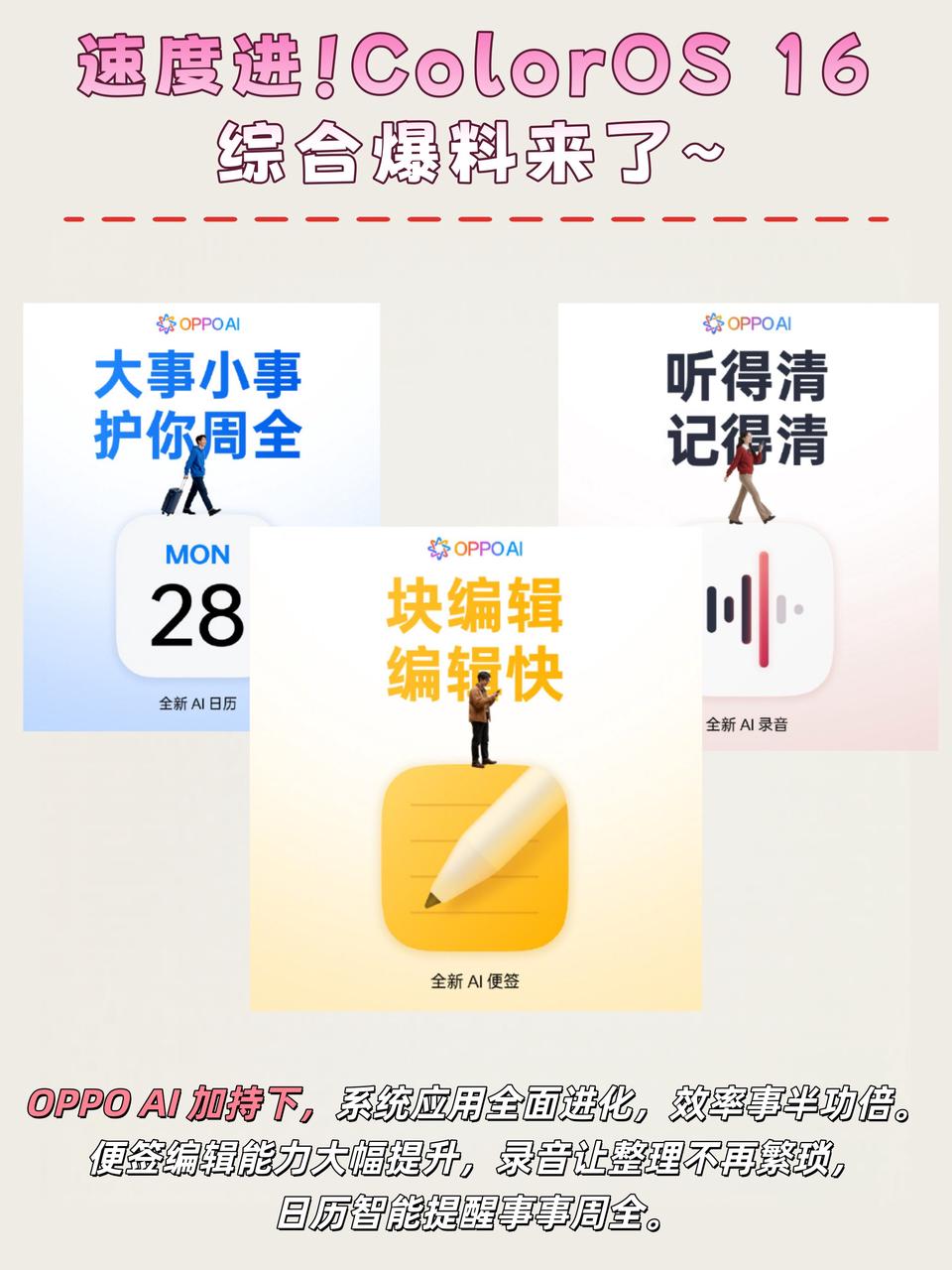 而AI功能也将全面铺开,ColorOS 16的相册、便签、录音这些日常应用都会变得更加智能,还新增了AI人像补光、AI人声增强这些实用功能。