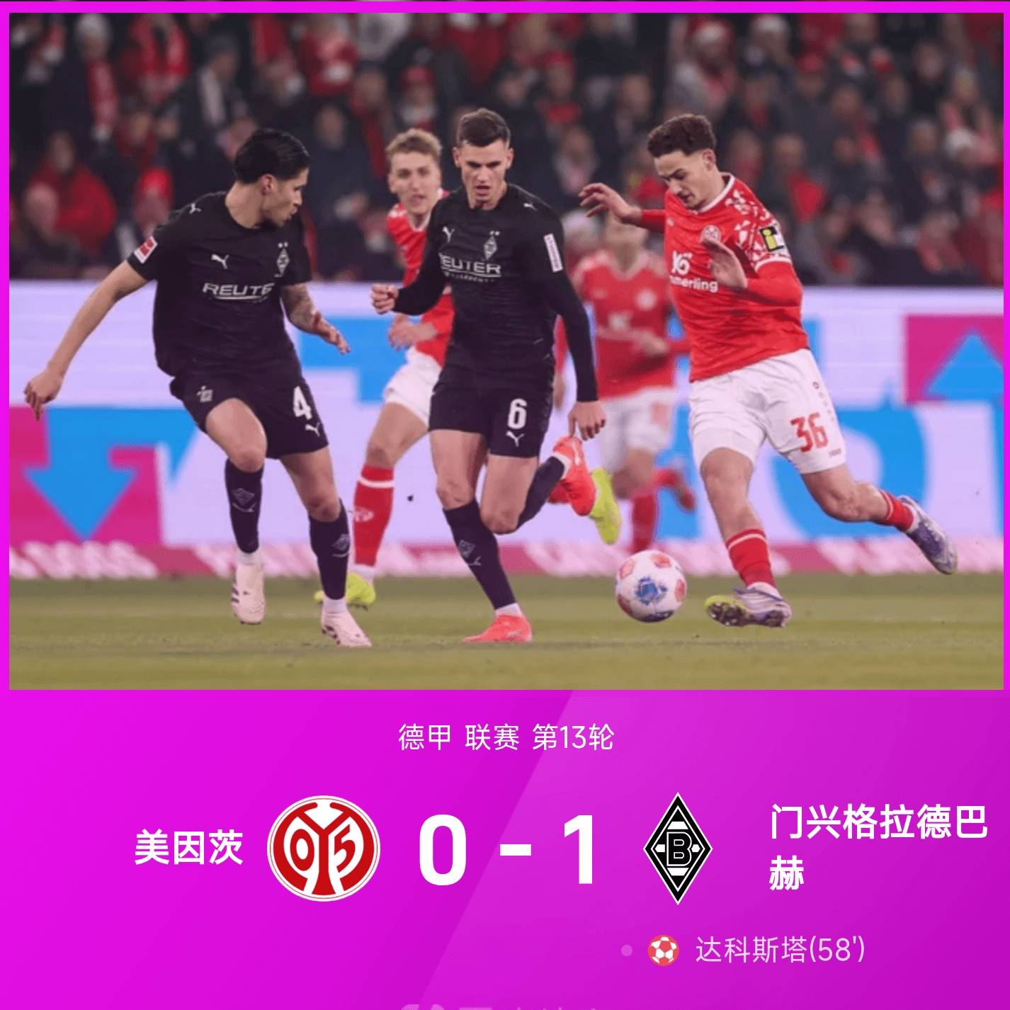 2025-2026赛季德国足球甲级联赛第13轮比赛中,美因茨队主场0比1负于门兴格拉德巴赫队。