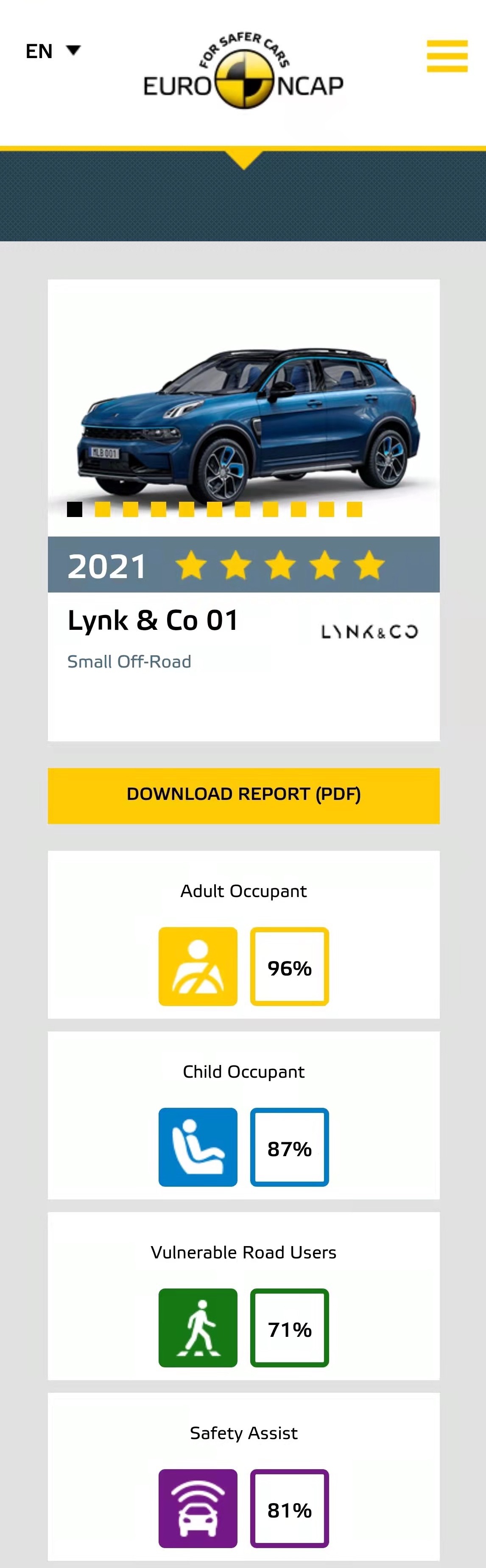安全更是领克01的一大亮点。基于CMA架构打造,采用热成型钢、高强度钢和铝合金等材料打造笼式车身结构,全车标配了多气囊配置,车内乘员在发生碰撞时能够得到更全面的保护。同时,它还获得了C-NCAP安全碰撞测试五星+、E-NCAP安全碰撞测试五星和中保研安全碰撞测试全优的优异成绩,实现了中欧双五星安全大满贯。