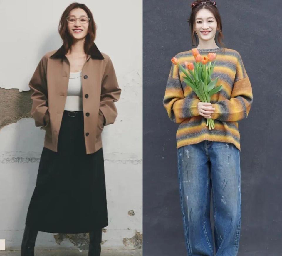 李小冉的穿搭中,基础款单品重复出现。 她常穿修身白衬衫与小黑裙,通过“松弛有度”的搭配模式,勾勒身材曲线并隐藏胯宽、臀肥、腿粗的问题。 她偏好夹克外套、条纹毛衣、A字裙、牛仔阔腿裤等无龄感单品,这些款式简约、版型合身,没有复杂装饰或剪裁,驾驭起来轻松且不易过时。