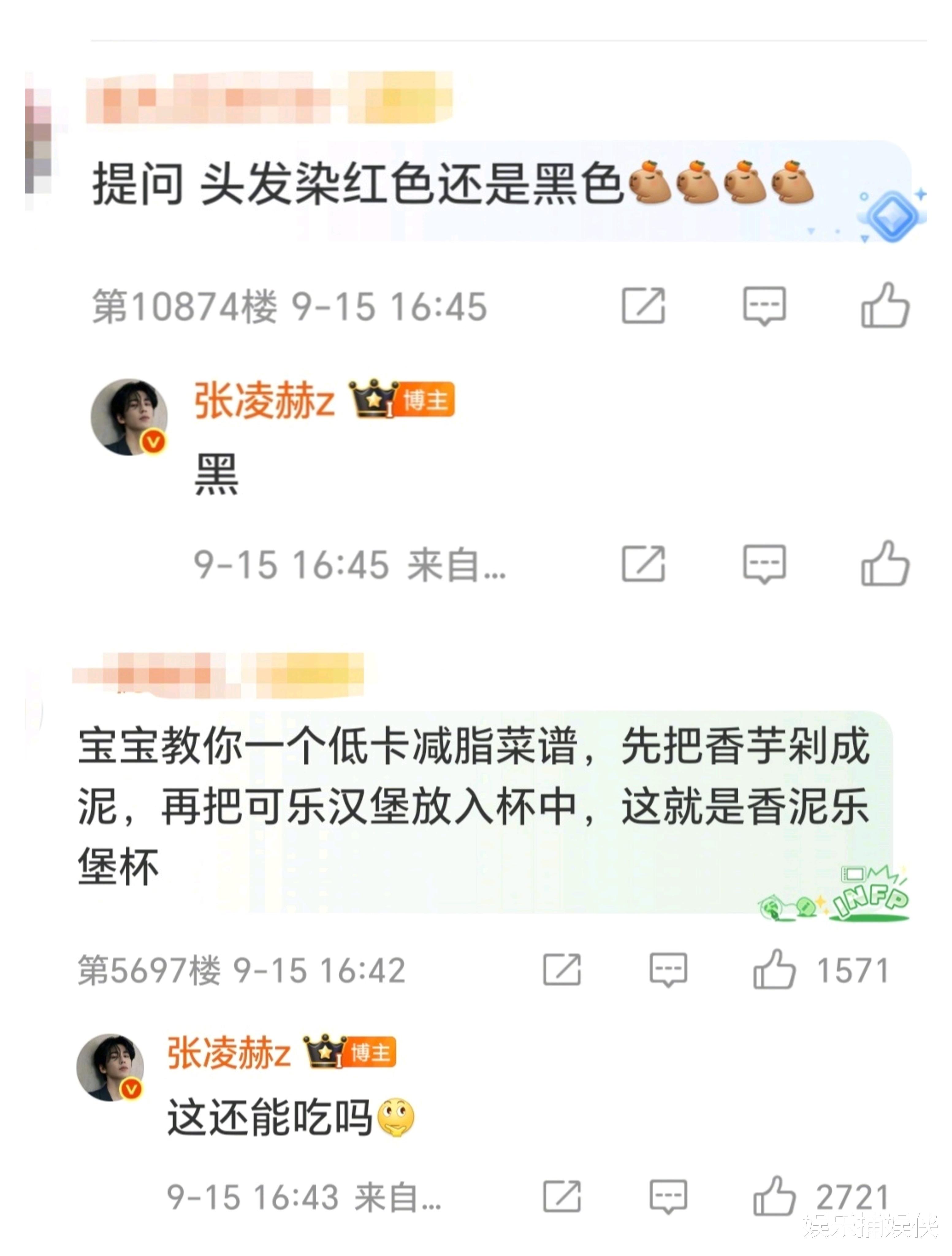 然而,当另一名粉丝用谐音梗提问“发色‘焦绿’怎么办?”时,画风突变。张凌赫逐字阅读后困惑回应:“这还能吃吗?”瞬间戳中网友笑点。评论区秒变段子手大赛,有人科普“焦绿=焦虑”,有人调侃“张老师认真到连谐音梗都当学术问题研究”,更有粉丝笑称:“谐音梗翻车现场,但可爱度满分!”