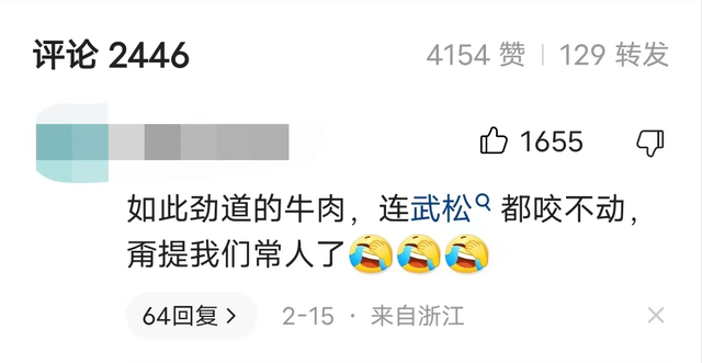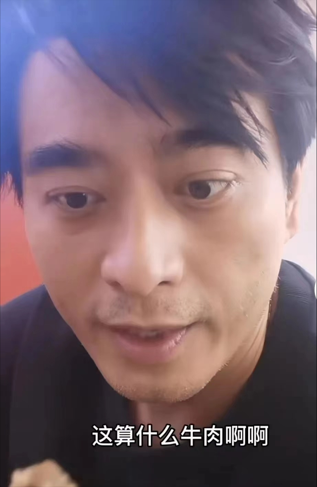 从陈龙的镜头中可以看得出来,他用筷子夹起了几块牛肉,然后把牛肉放在嘴巴里面,使劲搅都搅不动,无数网友纷纷调侃,就连武松这么厉害的人物,都嚼不动这块牛肉,可见这块牛肉是多么地僵硬。