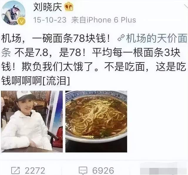 刘晓庆也在机场碰到同样的问题,一碗面竟然需要78元,这个价格让她惊呆了,她直接在社交平台上面发布,这一碗面并不是7块8,而是78元,她算了一笔账,平均一根面需要三块钱,如果不是饿了,根本就不会吃这个面。