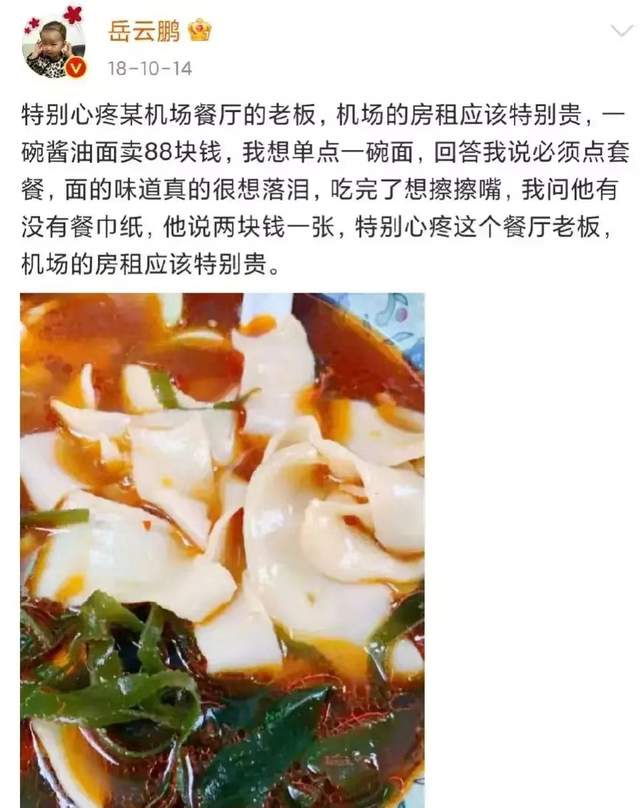 对于这样的事情,岳云鹏的态度却不一样,他曾经在机场吃了一碗面,结账时付了88元,随后需要一张纸巾擦嘴,谁知道老板说需要两元钱,但岳云鹏竟然说:老板你们也太不容易了,这里的租金应该很贵吧?