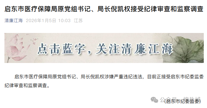 2026年1月5日,一则消息在南通政坛激起涟漪——启东市医疗保障局原党组书记、局长倪凯权,因涉嫌严重违纪违法,正接受启东市纪委监委的纪律审查和监察调查。这位曾一度活跃在医保改革一线、频频亮相于政策推进与调研现场的“改革型干部”,最终在新年伊始被推上反腐的风口浪尖,其人生轨迹的剧烈转折,令人唏嘘,更发人深省。