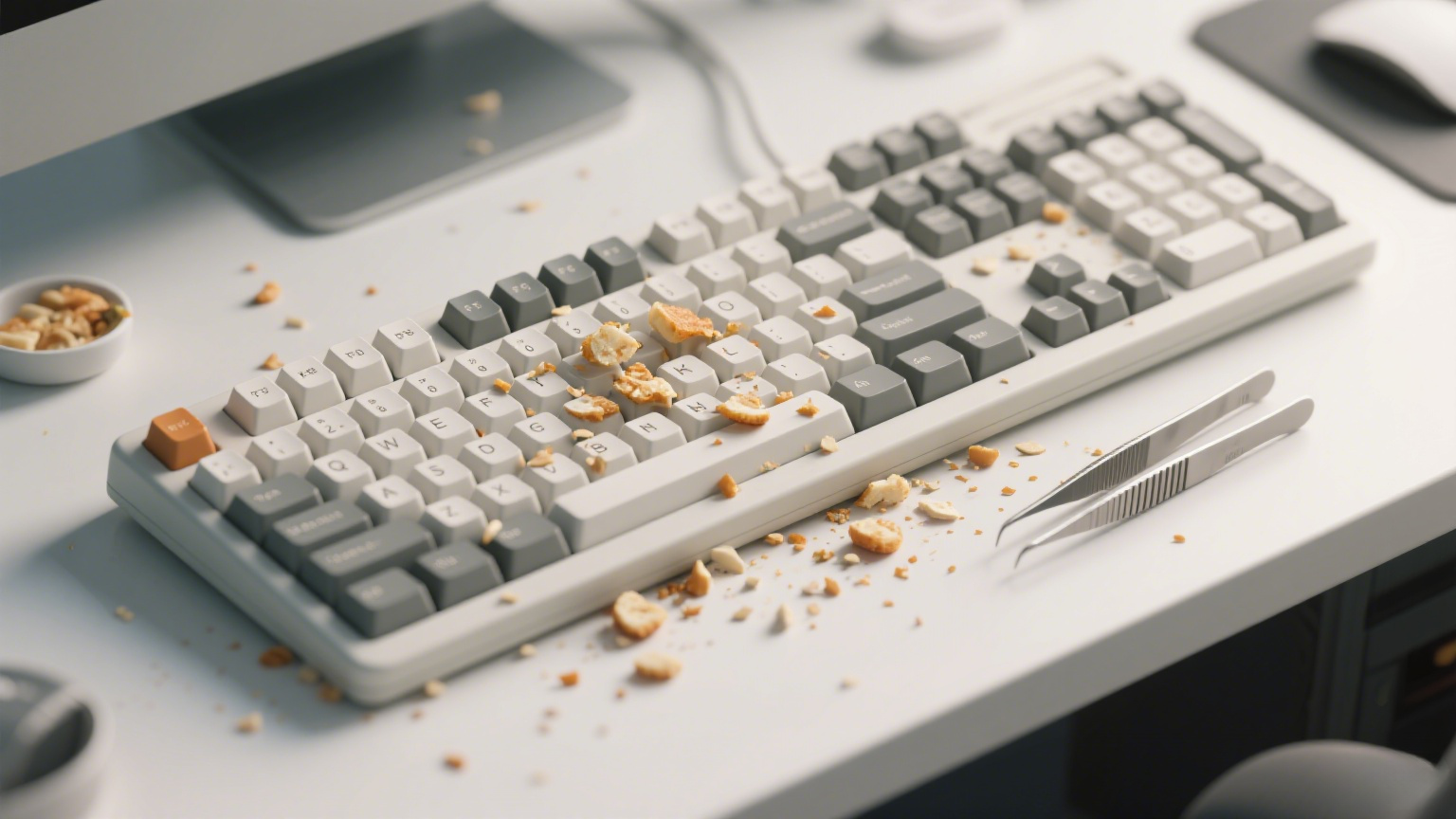 避免在键盘旁进食,防止食物碎屑掉落缝隙,若不慎掉落,及时用镊子夹出,避免长期堆积。
