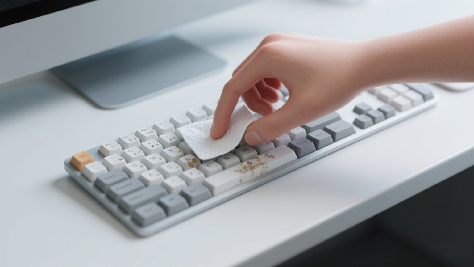 若临时发现键盘黏腻,身边没有专用工具,可撕取湿纸巾的一角,裹在牙签上(牙签头部需磨圆,避免划伤键盘),轻轻擦拭键帽缝隙,快速去除表面污渍;之后再用干纸巾擦干,防止水分残留。
