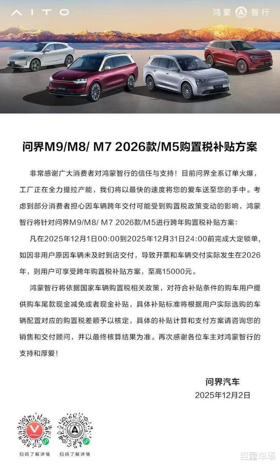 时值岁末,车市将迎来又一波购车热潮,购置税全免政策也进入收官倒计时。为进一步优化消费者购车体验,12月2日,问界汽车针对问界M9/问界M8/问界M7 2026款/问界M5推出了极具诚意的跨年购置税补贴方案:即日起至2025年12月31日24:00前完成大定锁单,如因非用户原因车辆未及时到店交付,导致开票和车辆交付实际发生在2026年,则用户可享受至高15000元跨年购置税补贴方案。该补贴将以购车尾款减免或现金补贴形式发放,具体补贴标准将根据用户实际选购的车辆配置对应的购置税差额予以核定。